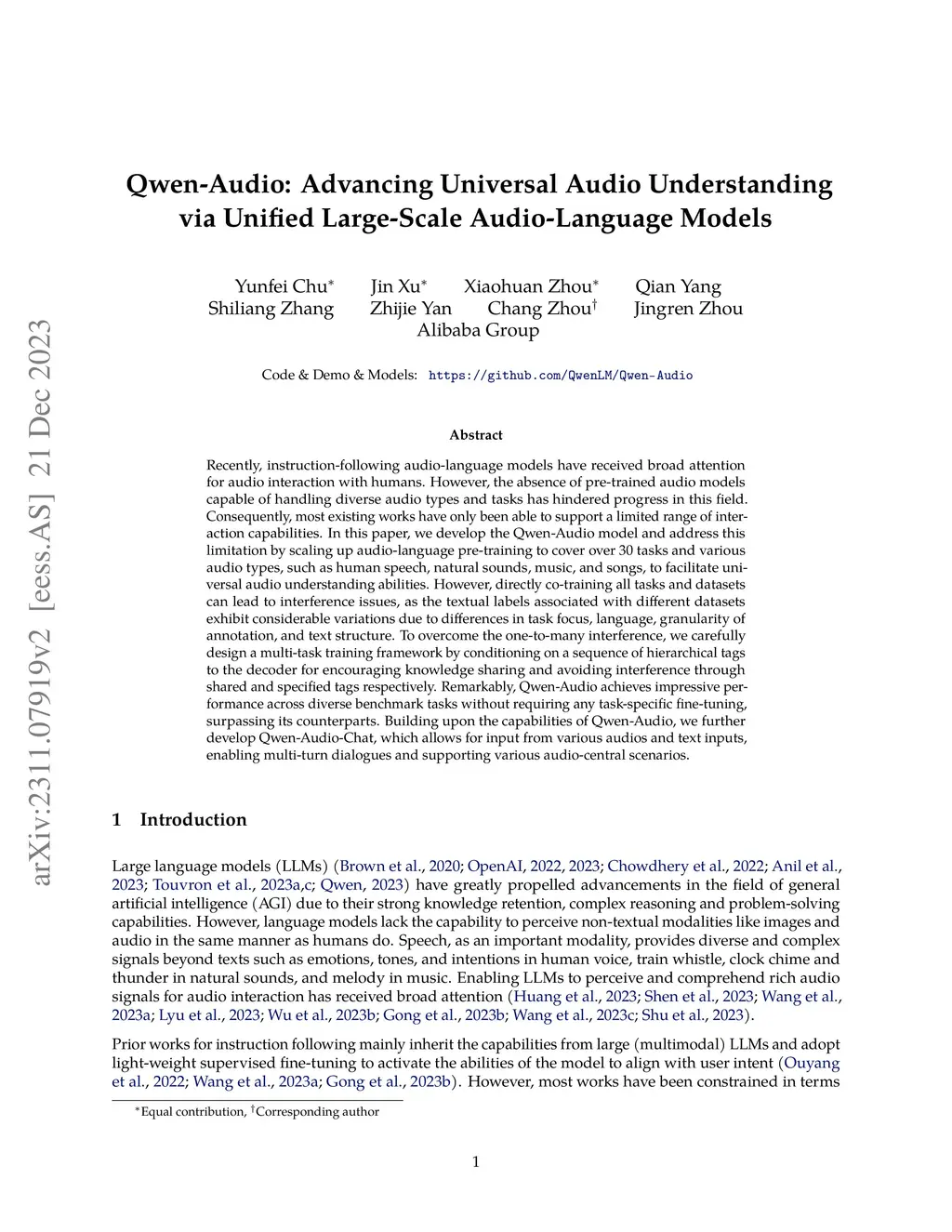 Qwen-Audio: Advancing Universal Audio Understanding via Unified