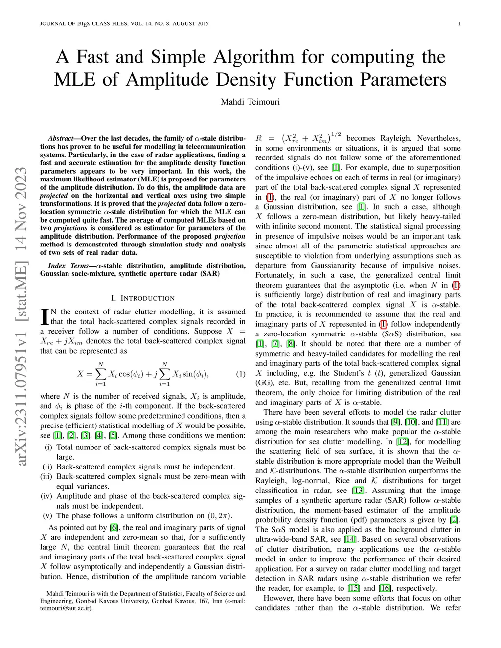 Over the last decades, the family of -stale distributions has proven to be useful for modelling in telecommunication systems. Particularly, in the case of radar applications, finding a fast and accurate estimation for the amplitude density function parameters appears to be very important. In this work, the maximum likelihood estimator (MLE) is proposed for parameters of the amplitude distribution. To do this, the amplitude data are \emph{projected} on the horizontal and vertical axes using two simple transformations. It is proved that the \emph{projected} data follow a zero-location symmetric -stale distribution for which the MLE can be computed quite fast. The average of computed MLEs based on two \emph{projections} is considered as estimator for parameters of the amplitude distribution. Performance of the proposed \emph{projection} method is demonstrated through simulation study and analysis of two sets of real radar data.