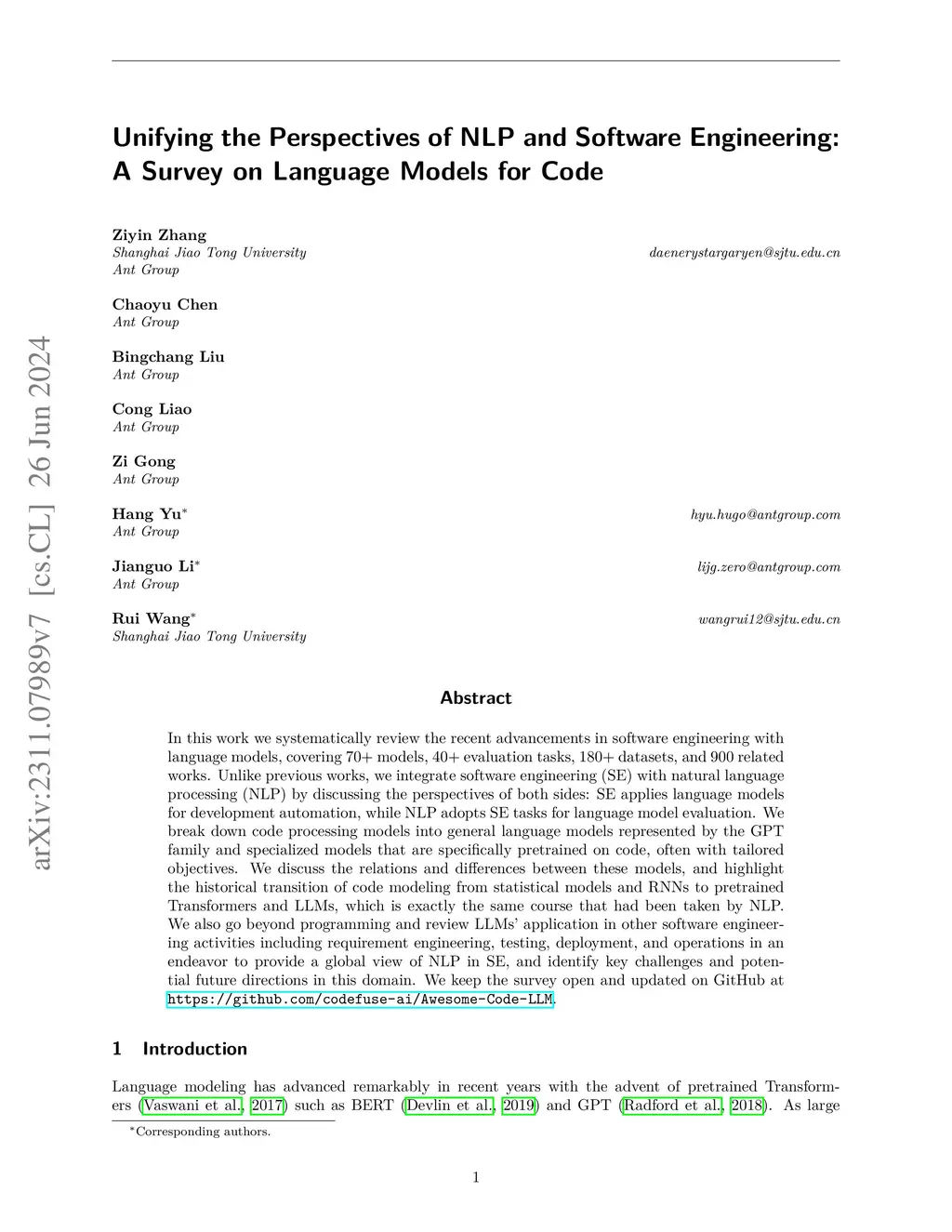 In this work we systematically review the recent advancements in code processing with language models, covering 50+ models, 30+ evaluation tasks, and 500 related works. We break down code processing models into general language models represented by the GPT family and specialized models that are specifically pretrained on code, often with tailored objectives. We discuss the relations and differences between these models, and highlight the historical transition of code modeling from statistical models and RNNs to pretrained Transformers and LLMs, which is exactly the same course that had been taken by NLP. We also discuss code-specific features such as AST, CFG, and unit tests, along with their application in training code language models, and identify key challenges and potential future directions in this domain. We keep the survey open and updated on github repository at https://github.com/codefuse-ai/Awesome-Code-LLM.