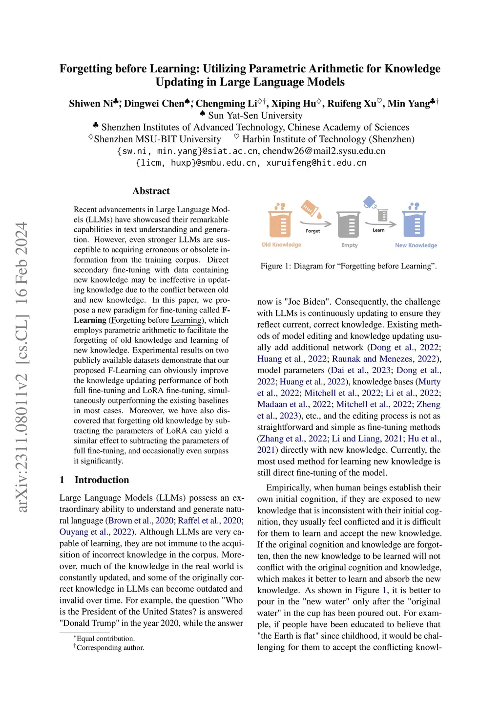 Recent advancements in Large Language Models (LLMs) have showcased their remarkable capabilities in text understanding and generation. However, even stronger LLMs are susceptible to acquiring erroneous or obsolete information from the training corpus. Direct secondary fine-tuning with data containing new knowledge may be ineffective in updating knowledge due to the conflict between old and new knowledge. In this paper, we propose a new paradigm for fine-tuning called F-Learning (Forgetting before Learning), which employs parametric arithmetic to facilitate the forgetting of old knowledge and learning of new knowledge. Experimental results on two publicly available datasets demonstrate that our proposed F-Learning can obviously improve the knowledge updating performance of both full fine-tuning and LoRA fine-tuning, simultaneously outperforming the existing baselines in most cases. Moreover, we have also discovered that forgetting old knowledge by subtracting the parameters of LoRA can yield a similar effect to subtracting the parameters of full fine-tuning, and occasionally even surpass it significantly.