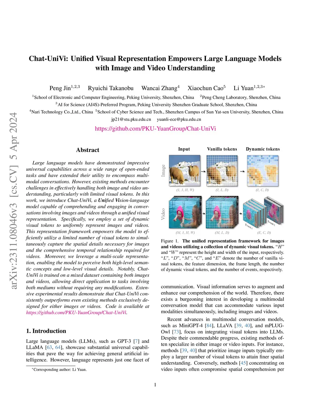 Chat-UniVi: Unified Visual Representation Empowers Large Language Models