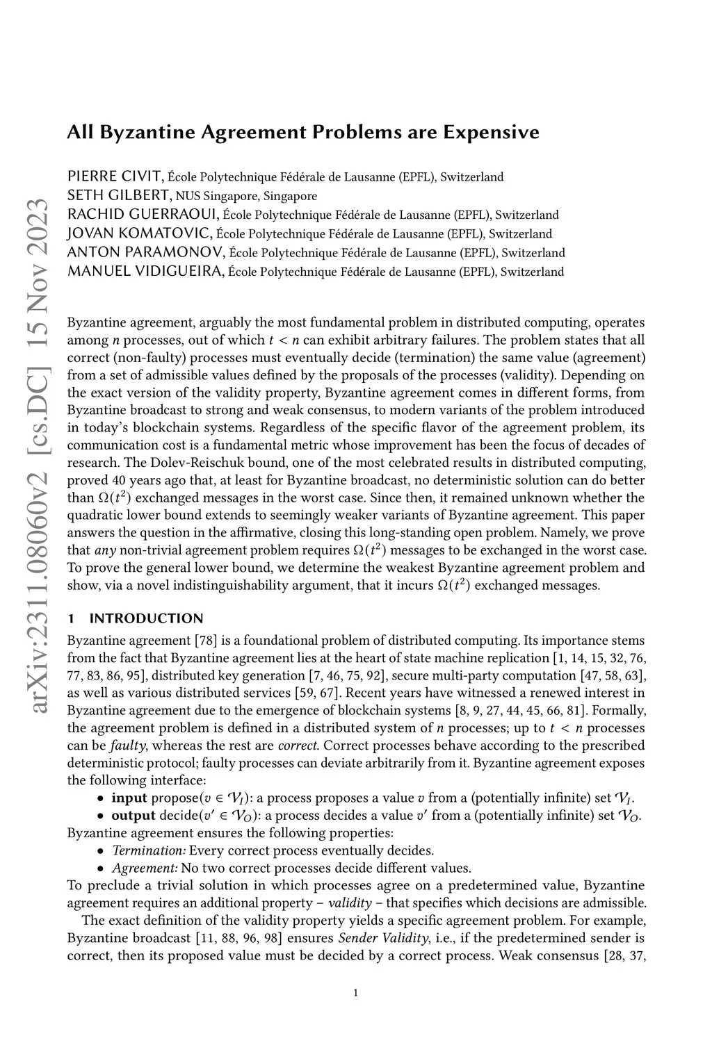 Byzantine agreement, arguably the most fundamental problem in distributed computing, operates among n processes, out of which t < n can exhibit arbitrary failures. The problem states that all correct (non-faulty) processes must eventually decide (termination) the same value (agreement) from a set of admissible values defined by the proposals of the processes (validity). Depending on the exact version of the validity property, Byzantine agreement comes in different forms, from Byzantine broadcast to strong and weak consensus, to modern variants of the problem introduced in today's blockchain systems. Regardless of the specific flavor of the agreement problem, its communication cost is a fundamental metric whose improvement has been the focus of decades of research. The Dolev-Reischuk bound, one of the most celebrated results in distributed computing, proved 40 years ago that, at least for Byzantine broadcast, no deterministic solution can do better than Omega(t^2) exchanged messages in the worst case. Since then, it remained unknown whether the quadratic lower bound extends to seemingly weaker variants of Byzantine agreement. This paper answers the question in the affirmative, closing this long-standing open problem. Namely, we prove that any non-trivial agreement problem requires Omega(t^2) messages to be exchanged in the worst case. To prove the general lower bound, we determine the weakest Byzantine agreement problem and show, via a novel indistinguishability argument, that it incurs Omega(t^2) exchanged messages.