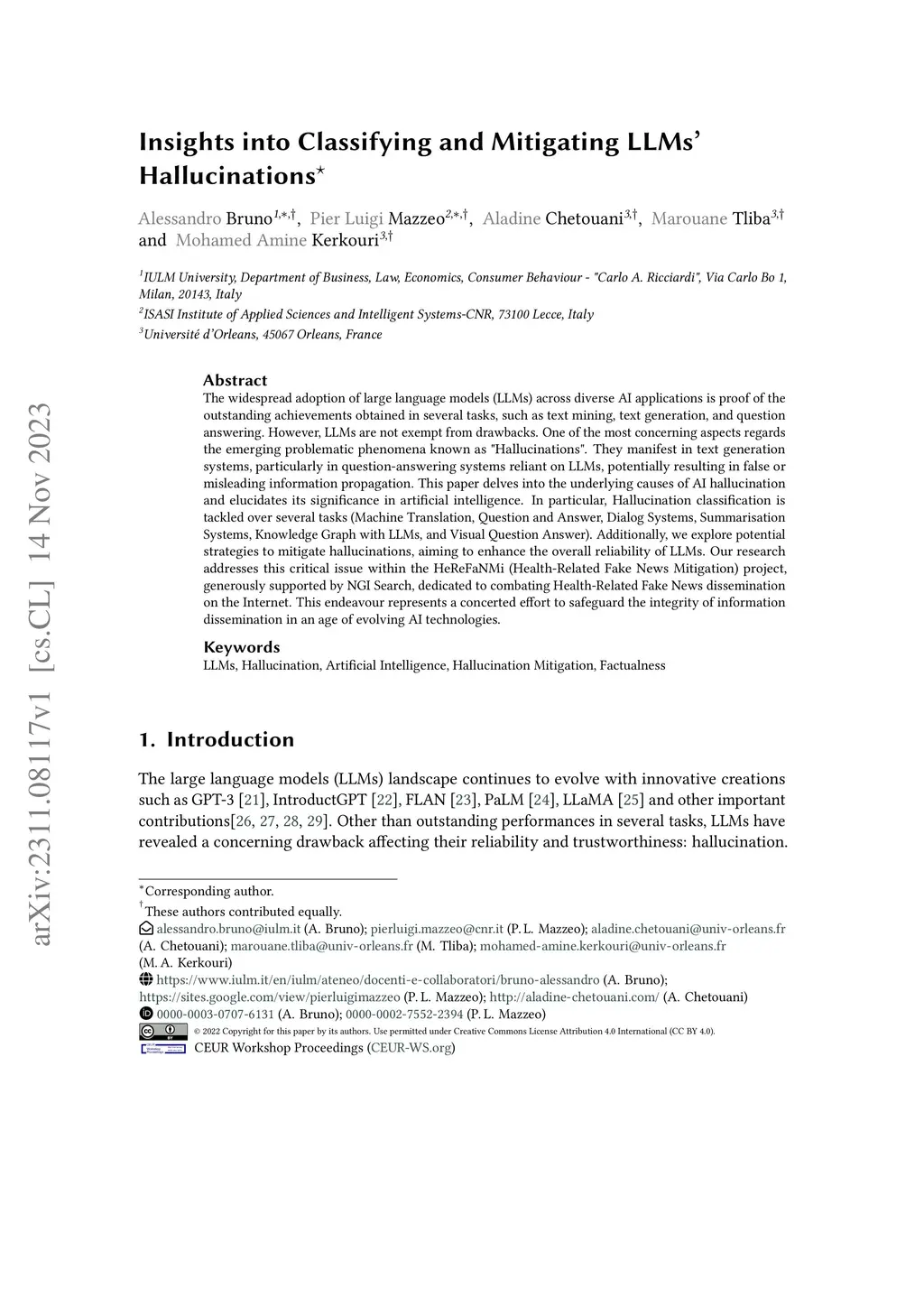 The widespread adoption of large language models (LLMs) across diverse AI applications is proof of the outstanding achievements obtained in several tasks, such as text mining, text generation, and question answering. However, LLMs are not exempt from drawbacks. One of the most concerning aspects regards the emerging problematic phenomena known as "Hallucinations". They manifest in text generation systems, particularly in question-answering systems reliant on LLMs, potentially resulting in false or misleading information propagation. This paper delves into the underlying causes of AI hallucination and elucidates its significance in artificial intelligence. In particular, Hallucination classification is tackled over several tasks (Machine Translation, Question and Answer, Dialog Systems, Summarisation Systems, Knowledge Graph with LLMs, and Visual Question Answer). Additionally, we explore potential strategies to mitigate hallucinations, aiming to enhance the overall reliability of LLMs. Our research addresses this critical issue within the HeReFaNMi (Health-Related Fake News Mitigation) project, generously supported by NGI Search, dedicated to combating Health-Related Fake News dissemination on the Internet. This endeavour represents a concerted effort to safeguard the integrity of information dissemination in an age of evolving AI technologies.