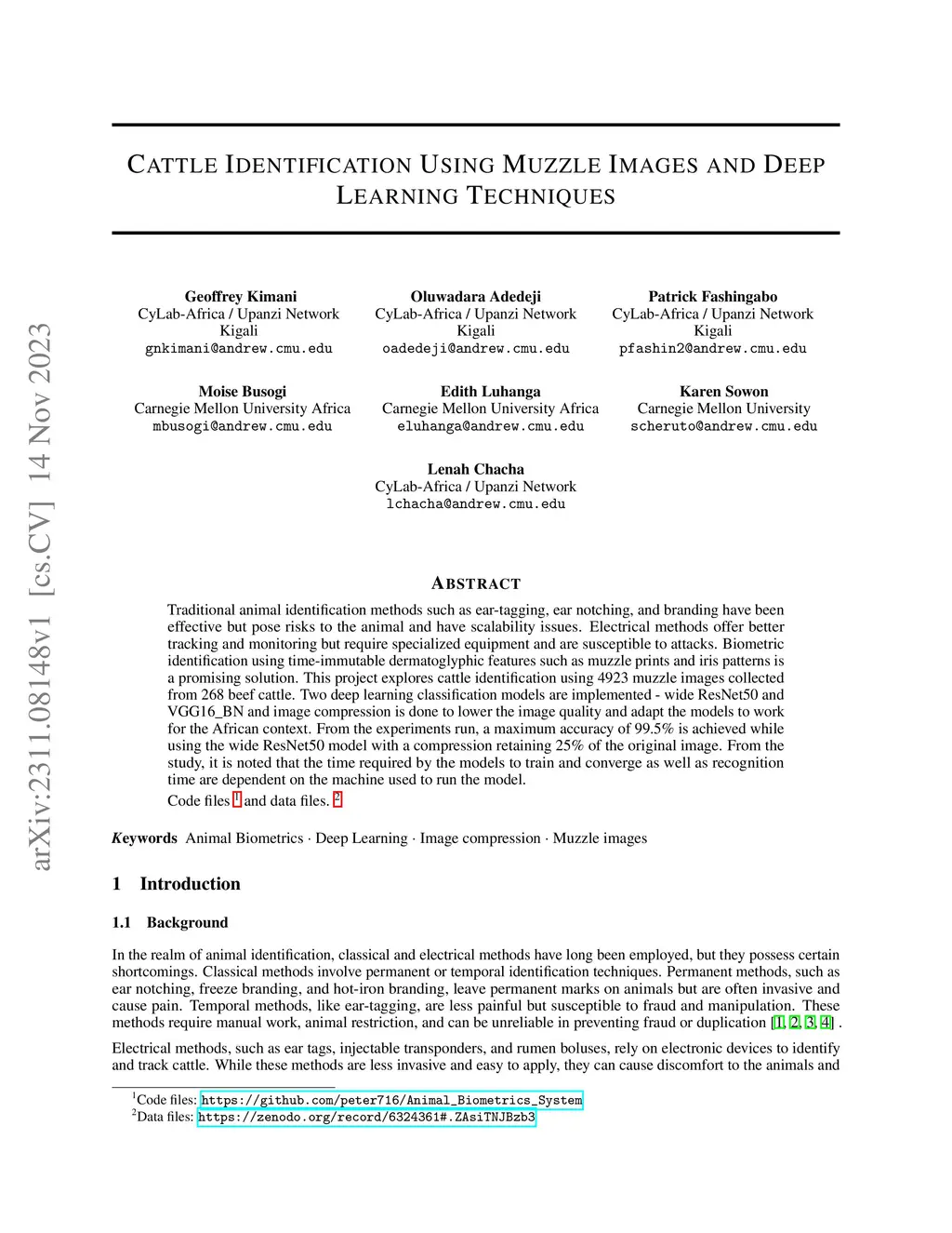 Traditional animal identification methods such as ear-tagging, ear notching, and branding have been effective but pose risks to the animal and have scalability issues. Electrical methods offer better tracking and monitoring but require specialized equipment and are susceptible to attacks. Biometric identification using time-immutable dermatoglyphic features such as muzzle prints and iris patterns is a promising solution. This project explores cattle identification using 4923 muzzle images collected from 268 beef cattle. Two deep learning classification models are implemented - wide ResNet50 and VGG16\_BN and image compression is done to lower the image quality and adapt the models to work for the African context. From the experiments run, a maximum accuracy of 99.5\% is achieved while using the wide ResNet50 model with a compression retaining 25\% of the original image. From the study, it is noted that the time required by the models to train and converge as well as recognition time are dependent on the machine used to run the model.