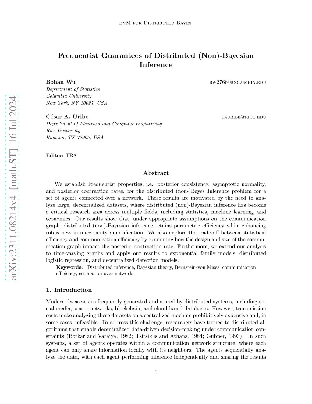 Motivated by the need to analyze large, decentralized datasets, distributed Bayesian inference has become a critical research area across multiple fields, including statistics, electrical engineering, and economics. This paper establishes Frequentist properties, such as posterior consistency, asymptotic normality, and posterior contraction rates, for the distributed (non-)Bayes Inference problem among agents connected via a communication network. Our results show that, under appropriate assumptions on the communication graph, distributed Bayesian inference retains parametric efficiency while enhancing robustness in uncertainty quantification. We also explore the trade-off between statistical efficiency and communication efficiency by examining how the design and size of the communication graph impact the posterior contraction rate. Furthermore, We extend our analysis to time-varying graphs and apply our results to exponential family models, distributed logistic regression, and decentralized detection models.