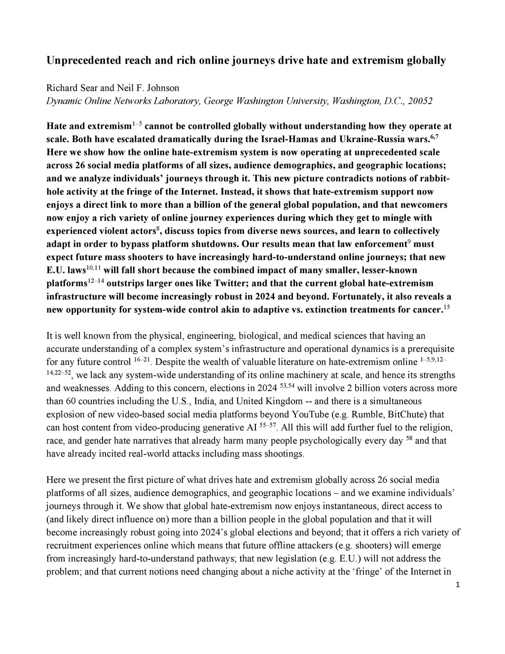 Hate and extremism cannot be controlled globally without understanding how they operate at scale. Both have escalated dramatically during the Israel-Hamas and Ukraine-Russia wars. Here we show how the online hate-extremism system is now operating at unprecedented scale across 26 social media platforms of all sizes, audience demographics, and geographic locations; and we analyze individuals' journeys through it. This new picture contradicts notions of rabbit-hole activity at the fringe of the Internet. Instead, it shows that hate-extremism support now enjoys a direct link to more than a billion of the general global population, and that newcomers now enjoy a rich variety of online journey experiences during which they get to mingle with experienced violent actors, discuss topics from diverse news sources, and learn to collectively adapt in order to bypass platform shutdowns. Our results mean that law enforcement must expect future mass shooters to have increasingly hard-to-understand online journeys; that new E.U. laws will fall short because the combined impact of many smaller, lesser-known platforms outstrips larger ones like Twitter; and that the current global hate-extremism infrastructure will become increasingly robust in 2024 and beyond. Fortunately, it also reveals a new opportunity for system-wide control akin to adaptive vs. extinction treatments for cancer.