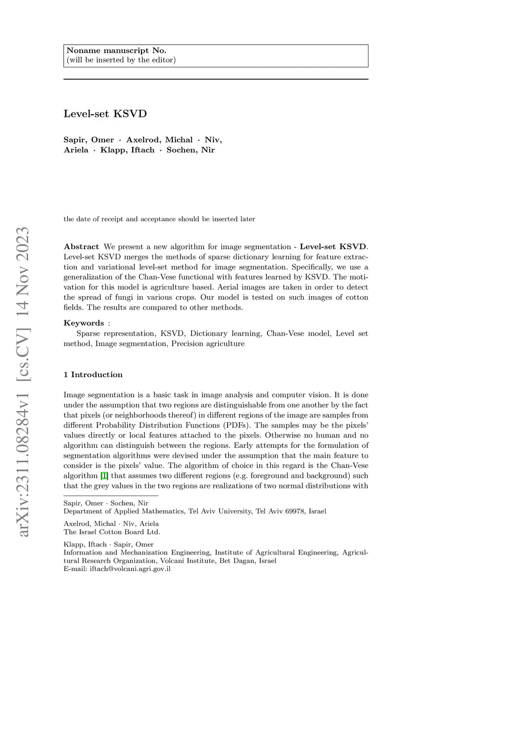 We present a new algorithm for image segmentation - Level-set KSVD. Level-set KSVD merges the methods of sparse dictionary learning for feature extraction and variational level-set method for image segmentation. Specifically, we use a generalization of the Chan-Vese functional with features learned by KSVD. The motivation for this model is agriculture based. Aerial images are taken in order to detect the spread of fungi in various crops. Our model is tested on such images of cotton fields. The results are compared to other methods.