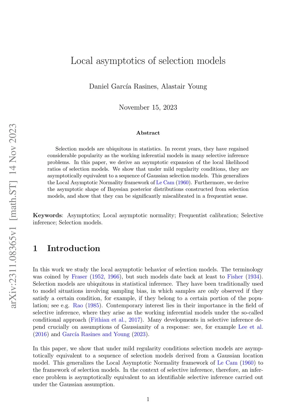 Selection models are ubiquitous in statistics. In recent years, they have regained considerable popularity as the working inferential models in many selective inference problems. In this paper, we derive an asymptotic expansion of the local likelihood ratios of selection models. We show that under mild regularity conditions, they are asymptotically equivalent to a sequence of Gaussian selection models. This generalizes the Local Asymptotic Normality framework of Le Cam (1960). Furthermore, we derive the asymptotic shape of Bayesian posterior distributions constructed from selection models, and show that they can be significantly miscalibrated in a frequentist sense.