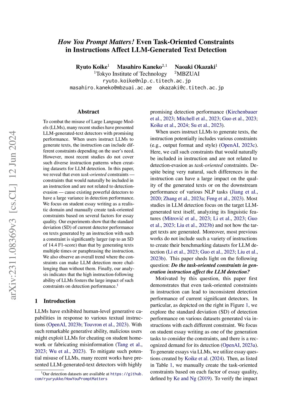 To combat the misuse of Large Language Models (LLMs), many recent studies have presented LLM-generated-text detectors with promising performance. When users instruct LLMs to generate texts, the instruction can include different constraints depending on the user's need. However, most recent studies do not cover such diverse instruction patterns when creating datasets for LLM detection. In this paper, we reveal that even task-oriented constraints -- constraints that would naturally be included in an instruction and are not related to detection-evasion -- cause existing powerful detectors to have a large variance in detection performance. We focus on student essay writing as a realistic domain and manually create task-oriented constraints based on several factors for essay quality. Our experiments show that the standard deviation (SD) of current detector performance on texts generated by an instruction with such a constraint is significantly larger (up to an SD of 14.4 F1-score) than that by generating texts multiple times or paraphrasing the instruction. We also observe an overall trend where the constraints can make LLM detection more challenging than without them. Finally, our analysis indicates that the high instruction-following ability of LLMs fosters the large impact of such constraints on detection performance.