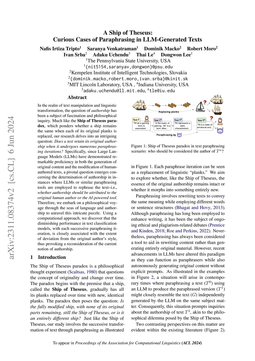 In the realm of text manipulation and linguistic transformation, the question of authorship has been a subject of fascination and philosophical inquiry. Much like the Ship of Theseus paradox, which ponders whether a ship remains the same when each of its original planks is replaced, our research delves into an intriguing question: Does a text retain its original authorship when it undergoes numerous paraphrasing iterations? Specifically, since Large Language Models (LLMs) have demonstrated remarkable proficiency in both the generation of original content and the modification of human-authored texts, a pivotal question emerges concerning the determination of authorship in instances where LLMs or similar paraphrasing tools are employed to rephrase the text--i.e., whether authorship should be attributed to the original human author or the AI-powered tool. Therefore, we embark on a philosophical voyage through the seas of language and authorship to unravel this intricate puzzle. Using a computational approach, we discover that the diminishing performance in text classification models, with each successive paraphrasing iteration, is closely associated with the extent of deviation from the original author's style, thus provoking a reconsideration of the current notion of authorship.