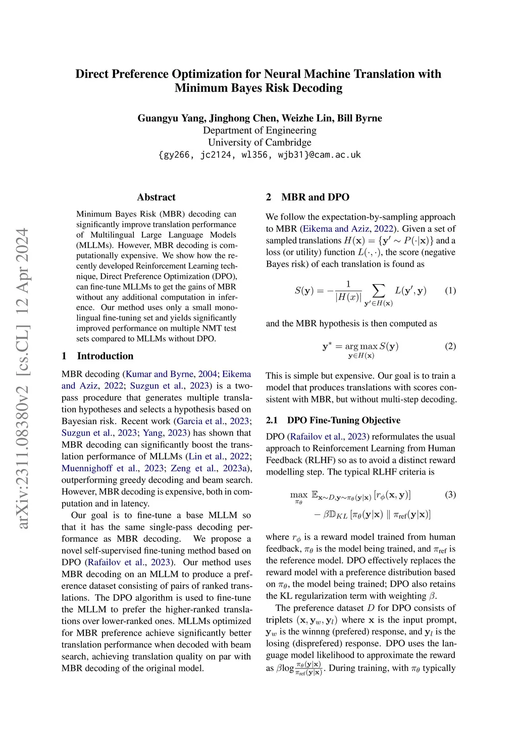 Minimum Bayes Risk (MBR) decoding can significantly improve translation performance of Multilingual Large Language Models (MLLMs). However, MBR decoding is computationally expensive. We show how the recently developed Reinforcement Learning technique, Direct Preference Optimization (DPO), can fine-tune MLLMs to get the gains of MBR without any additional computation in inference. Our method uses only a small monolingual fine-tuning set and yields significantly improved performance on multiple NMT test sets compared to MLLMs without DPO.
