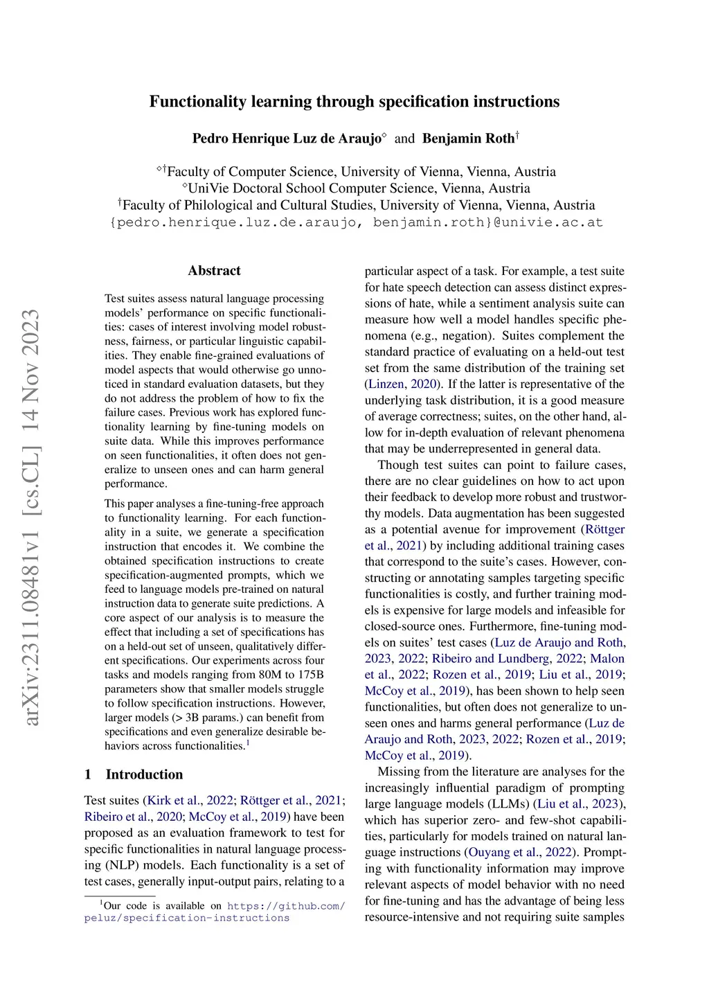Test suites assess natural language processing models' performance on specific functionalities: cases of interest involving model robustness, fairness, or particular linguistic capabilities. They enable fine-grained evaluations of model aspects that would otherwise go unnoticed in standard evaluation datasets, but they do not address the problem of how to fix the failure cases. Previous work has explored functionality learning by fine-tuning models on suite data. While this improves performance on seen functionalities, it often does not generalize to unseen ones and can harm general performance. This paper analyses a fine-tuning-free approach to functionality learning. For each functionality in a suite, we generate a specification instruction that encodes it. We combine the obtained specification instructions to create specification-augmented prompts, which we feed to language models pre-trained on natural instruction data to generate suite predictions. A core aspect of our analysis is to measure the effect that including a set of specifications has on a held-out set of unseen, qualitatively different specifications. Our experiments across four tasks and models ranging from 80M to 175B parameters show that smaller models struggle to follow specification instructions. However, larger models (> 3B params.) can benefit from specifications and even generalize desirable behaviors across functionalities.