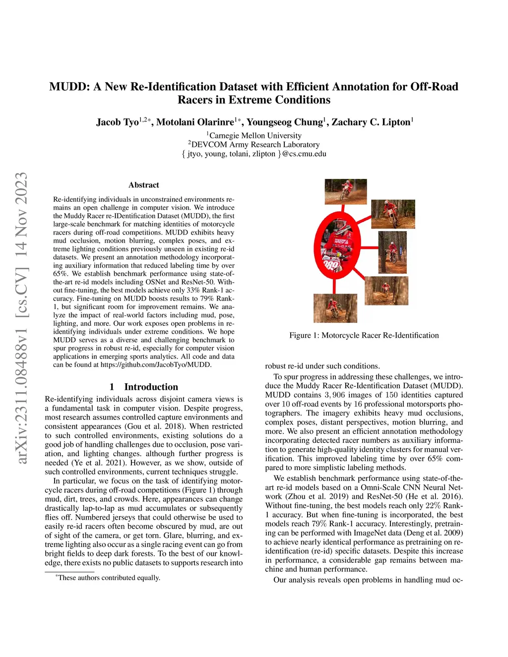 Re-identifying individuals in unconstrained environments remains an open challenge in computer vision. We introduce the Muddy Racer re-IDentification Dataset (MUDD), the first large-scale benchmark for matching identities of motorcycle racers during off-road competitions. MUDD exhibits heavy mud occlusion, motion blurring, complex poses, and extreme lighting conditions previously unseen in existing re-id datasets. We present an annotation methodology incorporating auxiliary information that reduced labeling time by over 65%. We establish benchmark performance using state-of-the-art re-id models including OSNet and ResNet-50. Without fine-tuning, the best models achieve only 33% Rank-1 accuracy. Fine-tuning on MUDD boosts results to 79% Rank-1, but significant room for improvement remains. We analyze the impact of real-world factors including mud, pose, lighting, and more. Our work exposes open problems in re-identifying individuals under extreme conditions. We hope MUDD serves as a diverse and challenging benchmark to spur progress in robust re-id, especially for computer vision applications in emerging sports analytics. All code and data can be found at https://github.com/JacobTyo/MUDD.