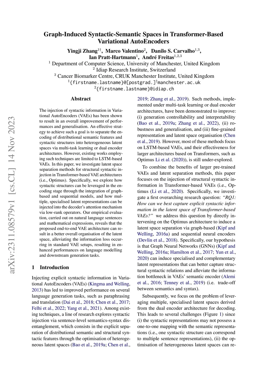 The injection of syntactic information in Variational AutoEncoders (VAEs) has been shown to result in an overall improvement of performances and generalisation. An effective strategy to achieve such a goal is to separate the encoding of distributional semantic features and syntactic structures into heterogeneous latent spaces via multi-task learning or dual encoder architectures. However, existing works employing such techniques are limited to LSTM-based VAEs. In this paper, we investigate latent space separation methods for structural syntactic injection in Transformer-based VAE architectures (i.e., Optimus). Specifically, we explore how syntactic structures can be leveraged in the encoding stage through the integration of graph-based and sequential models, and how multiple, specialised latent representations can be injected into the decoder's attention mechanism via low-rank operators. Our empirical evaluation, carried out on natural language sentences and mathematical expressions, reveals that the proposed end-to-end VAE architecture can result in a better overall organisation of the latent space, alleviating the information loss occurring in standard VAE setups, resulting in enhanced performances on language modelling and downstream generation tasks.
