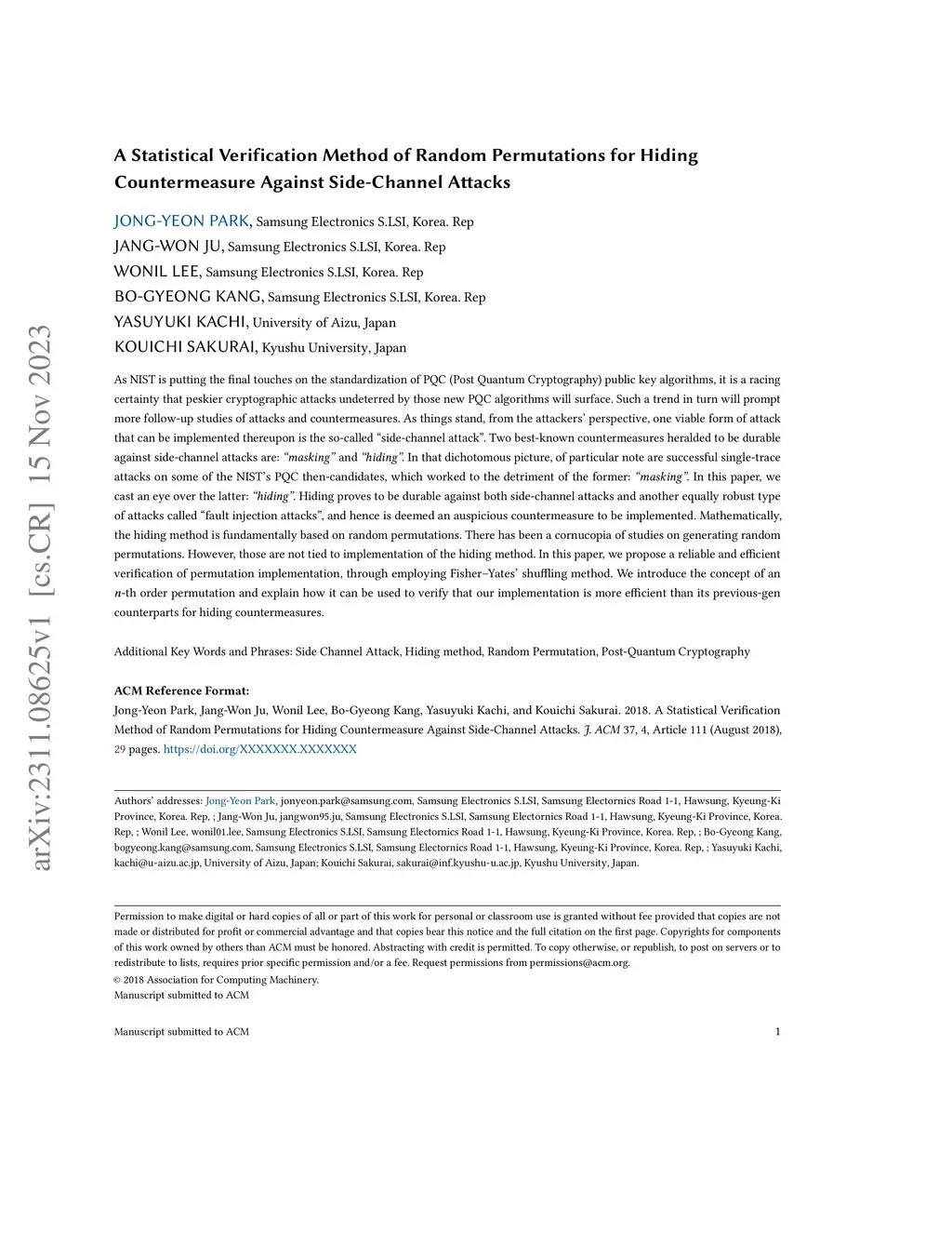 As NIST is putting the final touches on the standardization of PQC (Post Quantum Cryptography) public key algorithms, it is a racing certainty that peskier cryptographic attacks undeterred by those new PQC algorithms will surface. Such a trend in turn will prompt more follow-up studies of attacks and countermeasures. As things stand, from the attackers' perspective, one viable form of attack that can be implemented thereupon is the so-called "side-channel attack". Two best-known countermeasures heralded to be durable against side-channel attacks are: "masking" and "hiding". In that dichotomous picture, of particular note are successful single-trace attacks on some of the NIST's PQC then-candidates, which worked to the detriment of the former: "masking". In this paper, we cast an eye over the latter: "hiding". Hiding proves to be durable against both side-channel attacks and another equally robust type of attacks called "fault injection attacks", and hence is deemed an auspicious countermeasure to be implemented. Mathematically, the hiding method is fundamentally based on random permutations. There has been a cornucopia of studies on generating random permutations. However, those are not tied to implementation of the hiding method. In this paper, we propose a reliable and efficient verification of permutation implementation, through employing Fisher-Yates' shuffling method. We introduce the concept of an n-th order permutation and explain how it can be used to verify that our implementation is more efficient than its previous-gen counterparts for hiding countermeasures.
