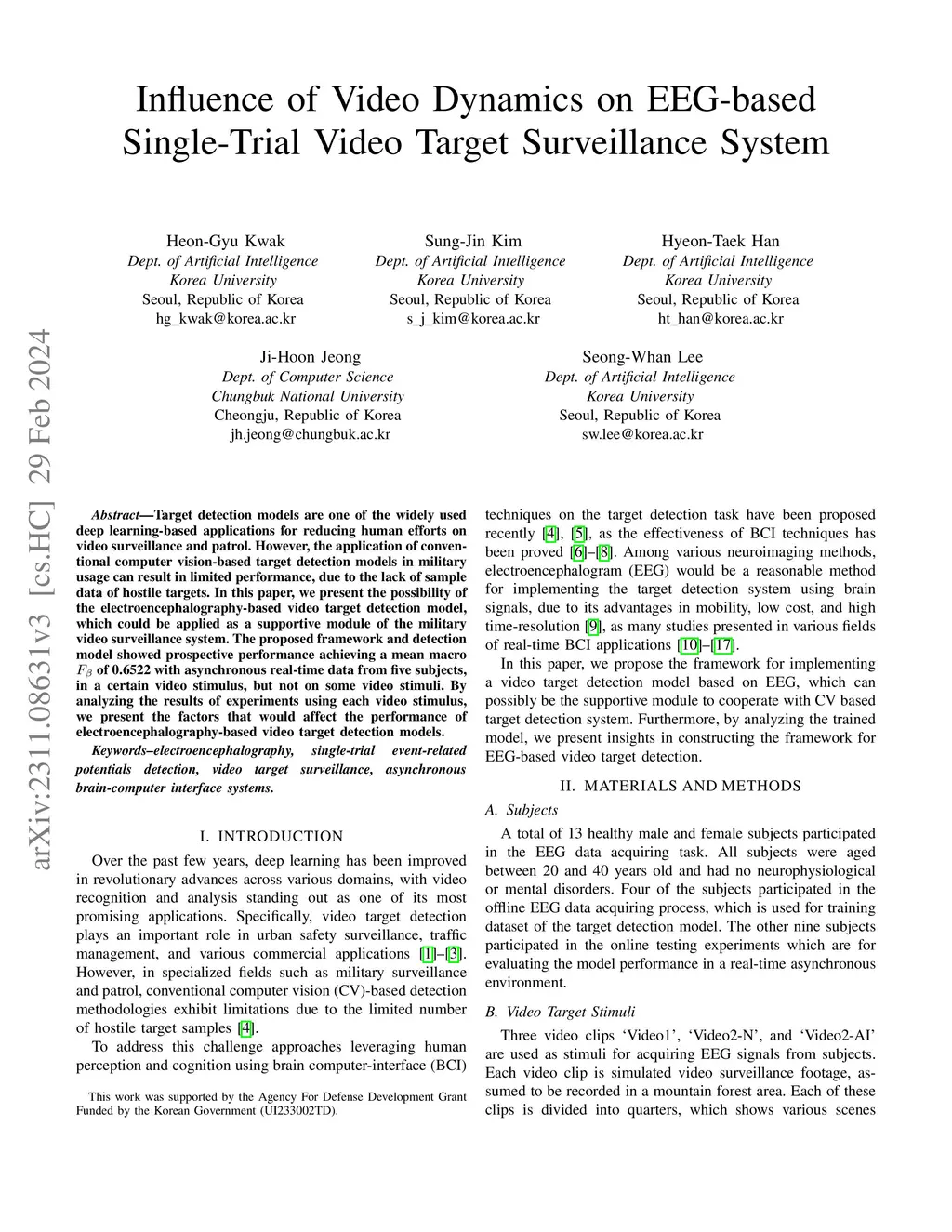 Target detection models are one of the widely used deep learning-based applications for reducing human efforts on video surveillance and patrol. However, the application of conventional computer vision-based target detection models in military usage can result in limited performance, due to the lack of sample data of hostile targets. In this paper, we present the possibility of the electroencephalography-based video target detection model, which could be applied as a supportive module of the military video surveillance system. The proposed framework and detection model showed prospective performance achieving a mean macro F-beta of 0.6522 with asynchronous real-time data from five subjects, in a certain video stimulus, but not on some video stimuli. By analyzing the results of experiments using each video stimulus, we present the factors that would affect the performance of electroencephalography-based video target detection models.