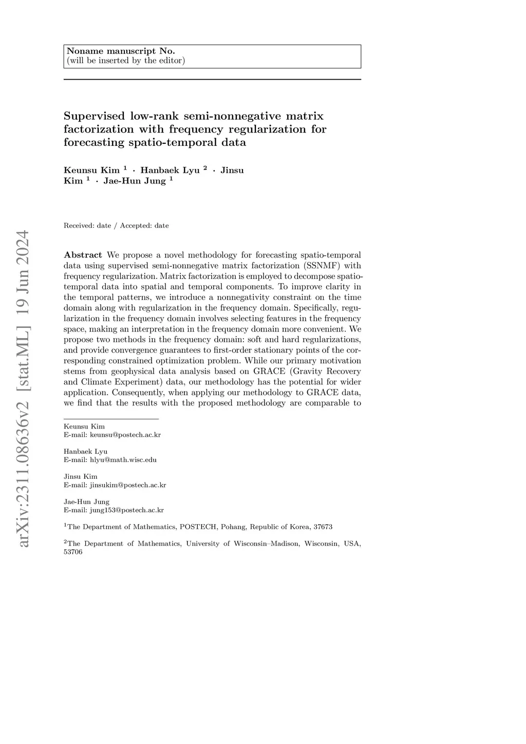 We propose a novel methodology for forecasting spatio-temporal data using supervised semi-nonnegative matrix factorization (SSNMF) with frequency regularization. Matrix factorization is employed to decompose spatio-temporal data into spatial and temporal components. To improve clarity in the temporal patterns, we introduce a nonnegativity constraint on the time domain along with regularization in the frequency domain. Specifically, regularization in the frequency domain involves selecting features in the frequency space, making an interpretation in the frequency domain more convenient. We propose two methods in the frequency domain: soft and hard regularizations, and provide convergence guarantees to first-order stationary points of the corresponding constrained optimization problem. While our primary motivation stems from geophysical data analysis based on GRACE (Gravity Recovery and Climate Experiment) data, our methodology has the potential for wider application. Consequently, when applying our methodology to GRACE data, we find that the results with the proposed methodology are comparable to previous research in the field of geophysical sciences but offer clearer interpretability.