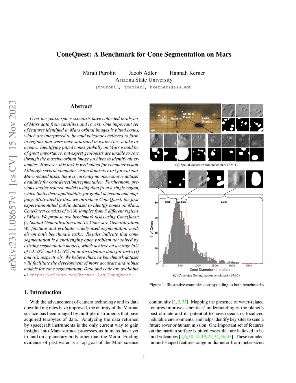 Over the years, space scientists have collected terabytes of Mars data from satellites and rovers. One important set of features identified in Mars orbital images is pitted cones, which are interpreted to be mud volcanoes believed to form in regions that were once saturated in water (i.e., a lake or ocean). Identifying pitted cones globally on Mars would be of great importance, but expert geologists are unable to sort through the massive orbital image archives to identify all examples. However, this task is well suited for computer vision. Although several computer vision datasets exist for various Mars-related tasks, there is currently no open-source dataset available for cone detection/segmentation. Furthermore, previous studies trained models using data from a single region, which limits their applicability for global detection and mapping. Motivated by this, we introduce ConeQuest, the first expert-annotated public dataset to identify cones on Mars. ConeQuest consists of >13k samples from 3 different regions of Mars. We propose two benchmark tasks using ConeQuest: (i) Spatial Generalization and (ii) Cone-size Generalization. We finetune and evaluate widely-used segmentation models on both benchmark tasks. Results indicate that cone segmentation is a challenging open problem not solved by existing segmentation models, which achieve an average IoU of 52.52% and 42.55% on in-distribution data for tasks (i) and (ii), respectively. We believe this new benchmark dataset will facilitate the development of more accurate and robust models for cone segmentation. Data and code are available at https://github.com/kerner-lab/ConeQuest.