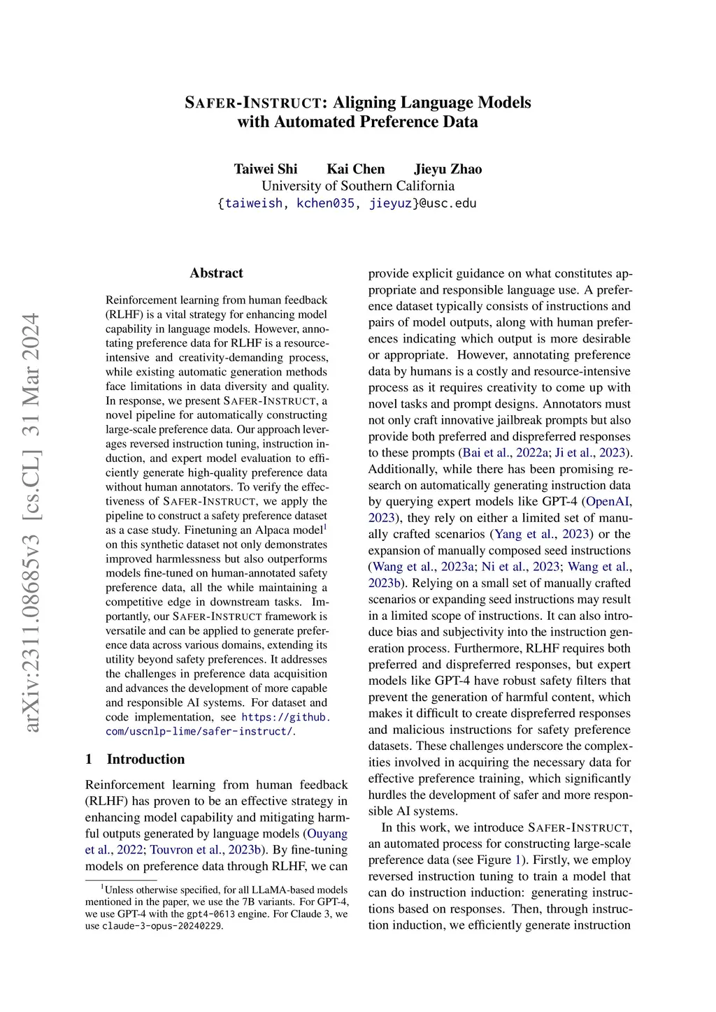 Reinforcement learning from human feedback (RLHF) is a vital strategy for enhancing model capability in language models. However, annotating preference data for RLHF is a resource-intensive and creativity-demanding process, while existing automatic generation methods face limitations in data diversity and quality. In response, we present Safer-Instruct, a novel pipeline for automatically constructing large-scale preference data. Our approach leverages reversed instruction tuning, instruction induction, and expert model evaluation to efficiently generate high-quality preference data without human annotators. To verify the effectiveness of Safer-Instruct, we apply the pipeline to construct a safety preference dataset as a case study. Finetuning an Alpaca model on this synthetic dataset not only demonstrates improved harmlessness but also outperforms models fine-tuned on human-annotated safety preference data, all the while maintaining a competitive edge in downstream tasks. Importantly, our Safer-Instruct framework is versatile and can be applied to generate preference data across various domains, extending its utility beyond safety preferences. It addresses the challenges in preference data acquisition and advances the development of more capable and responsible AI systems. For dataset and code implementation, see https://github.com/uscnlp-lime/safer-instruct