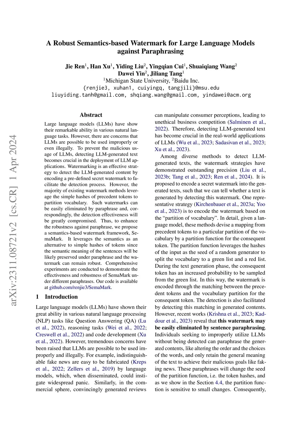 Large language models (LLMs) have show great ability in various natural language tasks. However, there are concerns that LLMs are possible to be used improperly or even illegally. To prevent the malicious usage of LLMs, detecting LLM-generated text becomes crucial in the deployment of LLM applications. Watermarking is an effective strategy to detect the LLM-generated content by encoding a pre-defined secret watermark to facilitate the detection process. However, the majority of existing watermark methods leverage the simple hashes of precedent tokens to partition vocabulary. Such watermark can be easily eliminated by paraphrase and correspondingly the detection effectiveness will be greatly compromised. Thus, to enhance the robustness against paraphrase, we propose a semantics-based watermark framework SemaMark. It leverages the semantics as an alternative to simple hashes of tokens since the paraphrase will likely preserve the semantic meaning of the sentences. Comprehensive experiments are conducted to demonstrate the effectiveness and robustness of SemaMark under different paraphrases.