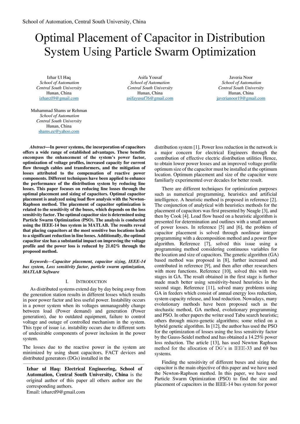 In power systems, the incorporation of capacitors offers a wide range of established advantages. These benefits encompass the enhancement of the systems power factor, optimization of voltage profiles, increased capacity for current flow through cables and transformers, and the mitigation of losses attributed to the compensation of reactive power components. Different techniques have been applied to enhance the performance of the distribution system by reducing line losses. This paper focuses on reducing line losses through the optimal placement and sizing of capacitors. Optimal capacitor placement is analysed using load flow analysis with the Newton Raphson method. The placement of capacitor optimization is related to the sensitivity of the buses, which depends on the loss sensitivity factor. The optimal capacitor size is determined using Particle Swarm Optimization (PSO). The analysis is conducted using the IEEE 14 bus system in MATLAB. The results reveal that placing capacitors at the most sensitive bus locations leads to a significant reduction in line losses. Additionally, the optimal capacitor size has a substantial impact on improving the voltage profile and the power loss is reduced by 21.02 percent through the proposed method.