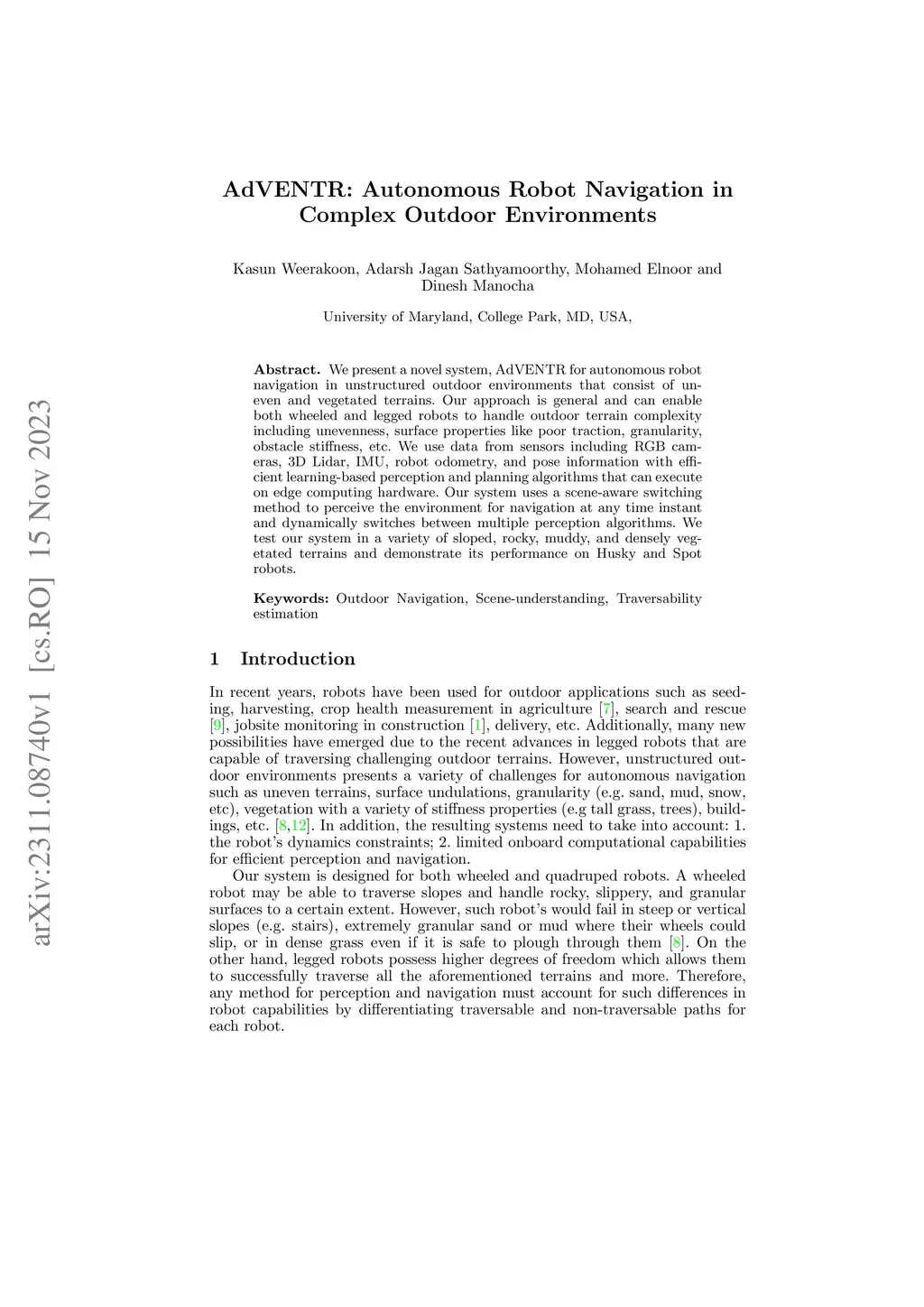 We present a novel system, AdVENTR for autonomous robot navigation in unstructured outdoor environments that consist of uneven and vegetated terrains. Our approach is general and can enable both wheeled and legged robots to handle outdoor terrain complexity including unevenness, surface properties like poor traction, granularity, obstacle stiffness, etc. We use data from sensors including RGB cameras, 3D Lidar, IMU, robot odometry, and pose information with efficient learning-based perception and planning algorithms that can execute on edge computing hardware. Our system uses a scene-aware switching method to perceive the environment for navigation at any time instant and dynamically switches between multiple perception algorithms. We test our system in a variety of sloped, rocky, muddy, and densely vegetated terrains and demonstrate its performance on Husky and Spot robots.