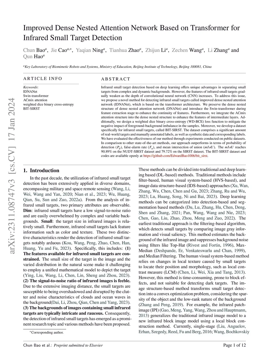 Infrared small target detection based on deep learning offers unique advantages in separating small targets from complex and dynamic backgrounds. However, the features of infrared small targets gradually weaken as the depth of convolutional neural network (CNN) increases. To address this issue, we propose a novel method for detecting infrared small targets called improved dense nested attention network (IDNANet), which is based on the transformer architecture. We preserve the dense nested structure of dense nested attention network (DNANet) and introduce the Swin-transformer during feature extraction stage to enhance the continuity of features. Furthermore, we integrate the ACmix attention structure into the dense nested structure to enhance the features of intermediate layers. Additionally, we design a weighted dice binary cross-entropy (WD-BCE) loss function to mitigate the negative impact of foreground-background imbalance in the samples. Moreover, we develop a dataset specifically for infrared small targets, called BIT-SIRST. The dataset comprises a significant amount of real-world targets and manually annotated labels, as well as synthetic data and corresponding labels. We have evaluated the effectiveness of our method through experiments conducted on public datasets. In comparison to other state-of-the-art methods, our approach outperforms in terms of probability of detection (), false-alarm rate (), and mean intersection of union (). The reaches 90.89\% on the NUDT-SIRST dataset and 79.72\% on the SIRST dataset. The BIT-SIRST dataset and codes are available openly at \href{https://github.com/EdwardBao1006/bit\_sirst}{\color[HTML]{B22222}{https://github.com/EdwardBao1006/bit\_sirst}}.