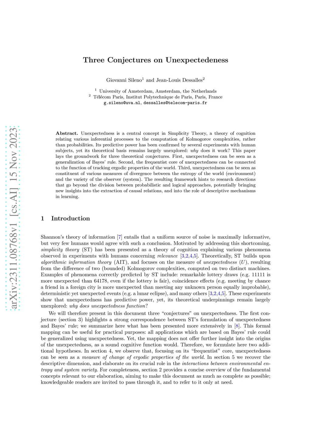 Unexpectedness is a central concept in Simplicity Theory, a theory of cognition relating various inferential processes to the computation of Kolmogorov complexities, rather than probabilities. Its predictive power has been confirmed by several experiments with human subjects, yet its theoretical basis remains largely unexplored: why does it work? This paper lays the groundwork for three theoretical conjectures. First, unexpectedness can be seen as a generalization of Bayes' rule. Second, the frequentist core of unexpectedness can be connected to the function of tracking ergodic properties of the world. Third, unexpectedness can be seen as constituent of various measures of divergence between the entropy of the world (environment) and the variety of the observer (system). The resulting framework hints to research directions that go beyond the division between probabilistic and logical approaches, potentially bringing new insights into the extraction of causal relations, and into the role of descriptive mechanisms in learning.
