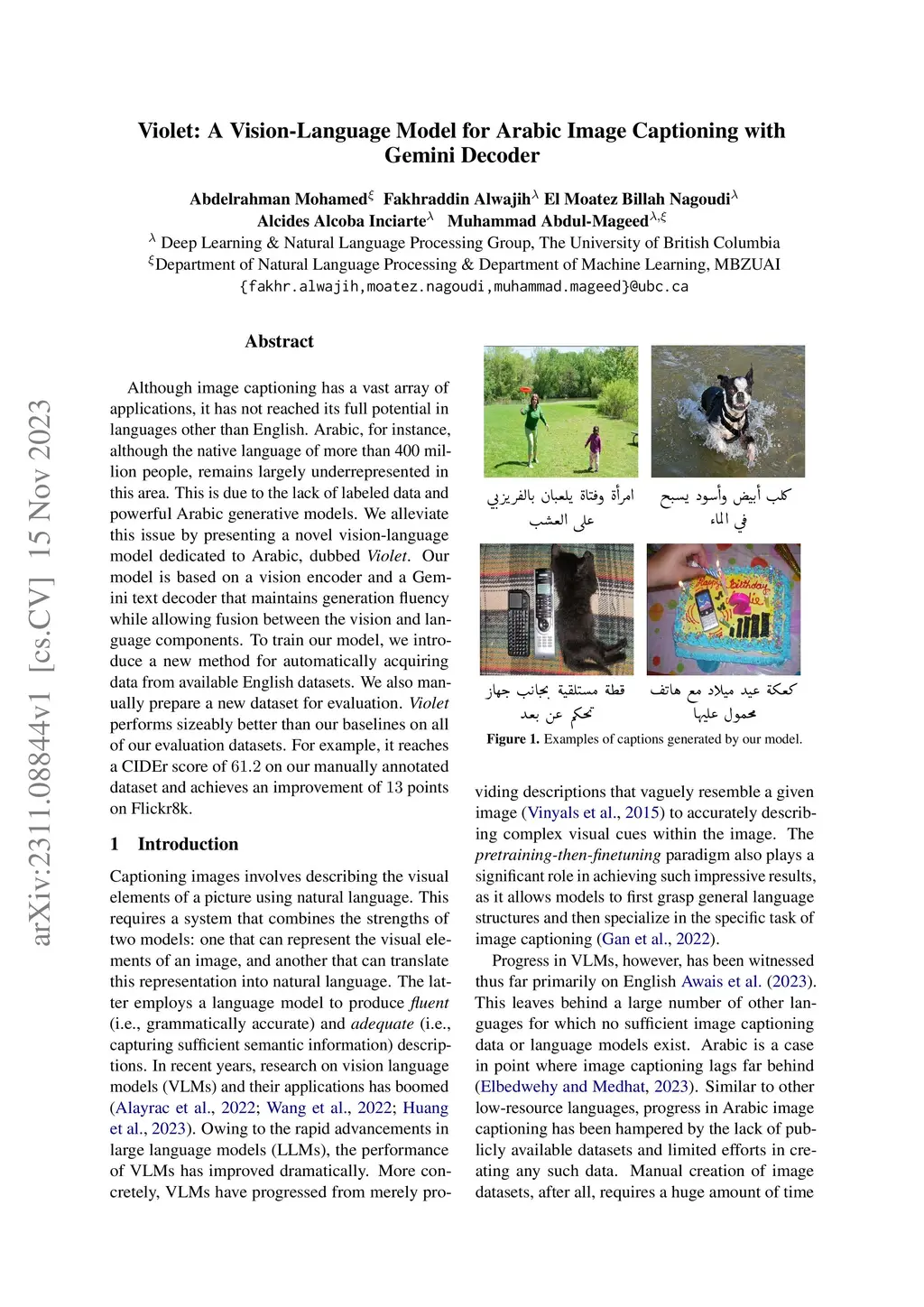 Violet: A Vision-Language Model for Arabic Image Captioning with Gemini