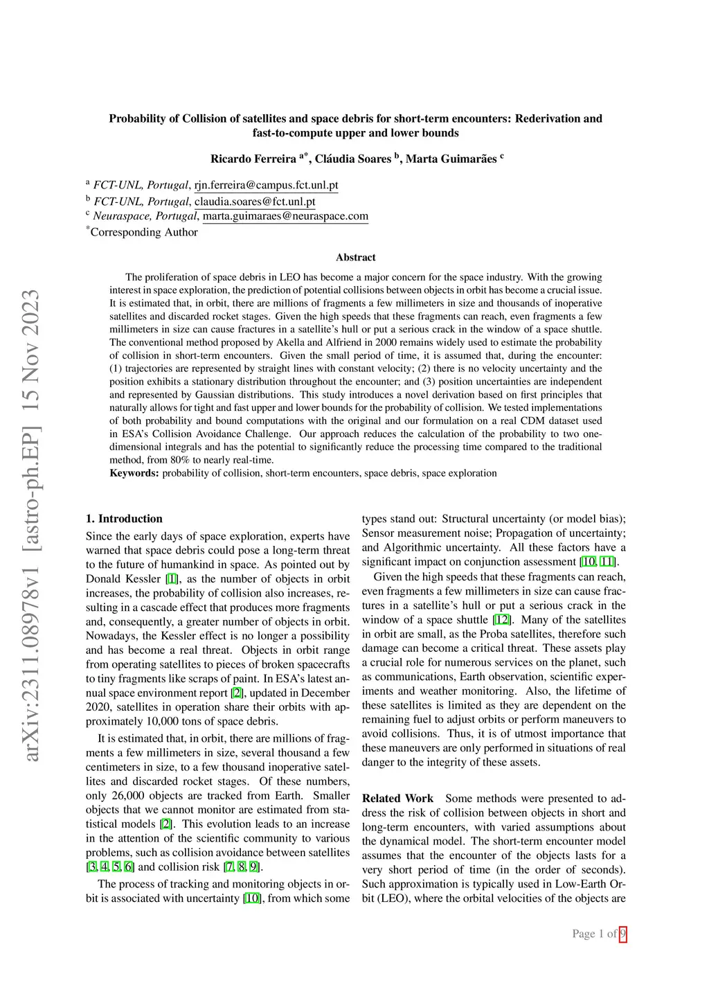 The proliferation of space debris in LEO has become a major concern for the space industry. With the growing interest in space exploration, the prediction of potential collisions between objects in orbit has become a crucial issue. It is estimated that, in orbit, there are millions of fragments a few millimeters in size and thousands of inoperative satellites and discarded rocket stages. Given the high speeds that these fragments can reach, even fragments a few millimeters in size can cause fractures in a satellite's hull or put a serious crack in the window of a space shuttle. The conventional method proposed by Akella and Alfriend in 2000 remains widely used to estimate the probability of collision in short-term encounters. Given the small period of time, it is assumed that, during the encounter: (1) trajectories are represented by straight lines with constant velocity; (2) there is no velocity uncertainty and the position exhibits a stationary distribution throughout the encounter; and (3) position uncertainties are independent and represented by Gaussian distributions. This study introduces a novel derivation based on first principles that naturally allows for tight and fast upper and lower bounds for the probability of collision. We tested implementations of both probability and bound computations with the original and our formulation on a real CDM dataset used in ESA's Collision Avoidance Challenge. Our approach reduces the calculation of the probability to two one-dimensional integrals and has the potential to significantly reduce the processing time compared to the traditional method, from 80% to nearly real-time.