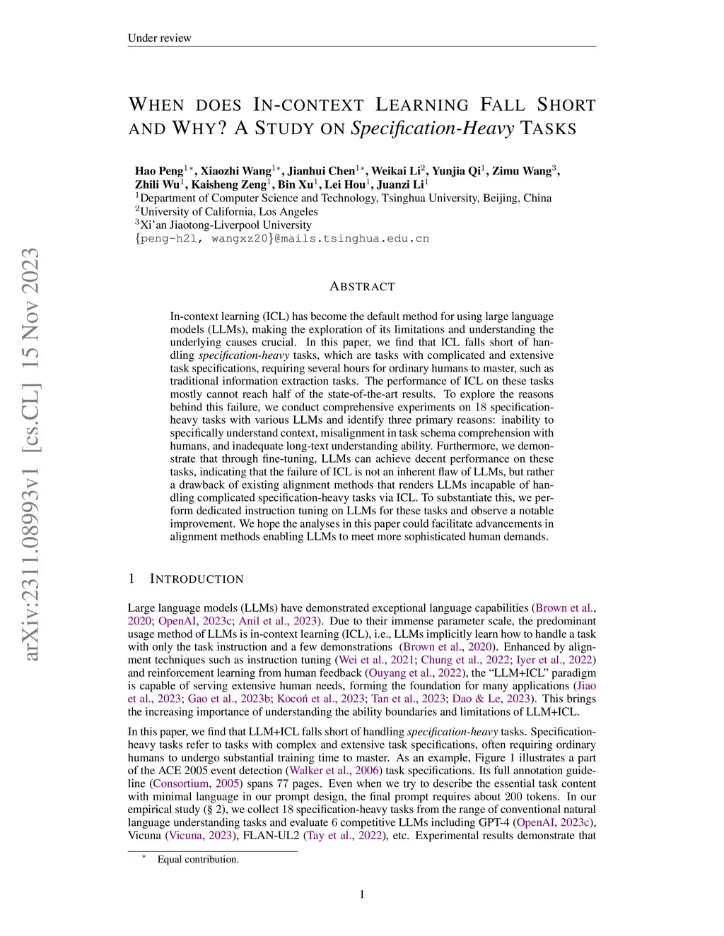 In-context learning (ICL) has become the default method for using large language models (LLMs), making the exploration of its limitations and understanding the underlying causes crucial. In this paper, we find that ICL falls short of handling specification-heavy tasks, which are tasks with complicated and extensive task specifications, requiring several hours for ordinary humans to master, such as traditional information extraction tasks. The performance of ICL on these tasks mostly cannot reach half of the state-of-the-art results. To explore the reasons behind this failure, we conduct comprehensive experiments on 18 specification-heavy tasks with various LLMs and identify three primary reasons: inability to specifically understand context, misalignment in task schema comprehension with humans, and inadequate long-text understanding ability. Furthermore, we demonstrate that through fine-tuning, LLMs can achieve decent performance on these tasks, indicating that the failure of ICL is not an inherent flaw of LLMs, but rather a drawback of existing alignment methods that renders LLMs incapable of handling complicated specification-heavy tasks via ICL. To substantiate this, we perform dedicated instruction tuning on LLMs for these tasks and observe a notable improvement. We hope the analyses in this paper could facilitate advancements in alignment methods enabling LLMs to meet more sophisticated human demands.