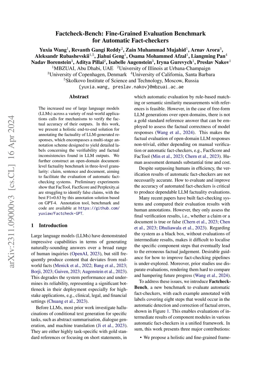 The increased use of large language models (LLMs) across a variety of real-world applications calls for mechanisms to verify the factual accuracy of their outputs. In this work, we present a holistic end-to-end solution for annotating the factuality of LLM-generated responses, which encompasses a multi-stage annotation scheme designed to yield detailed labels concerning the verifiability and factual inconsistencies found in LLM outputs. We further construct an open-domain document-level factuality benchmark in three-level granularity: claim, sentence and document, aiming to facilitate the evaluation of automatic fact-checking systems. Preliminary experiments show that FacTool, FactScore and Perplexity.ai are struggling to identify false claims, with the best F1=0.63 by this annotation solution based on GPT-4. Annotation tool, benchmark and code are available at https://github.com/yuxiaw/Factcheck-GPT.