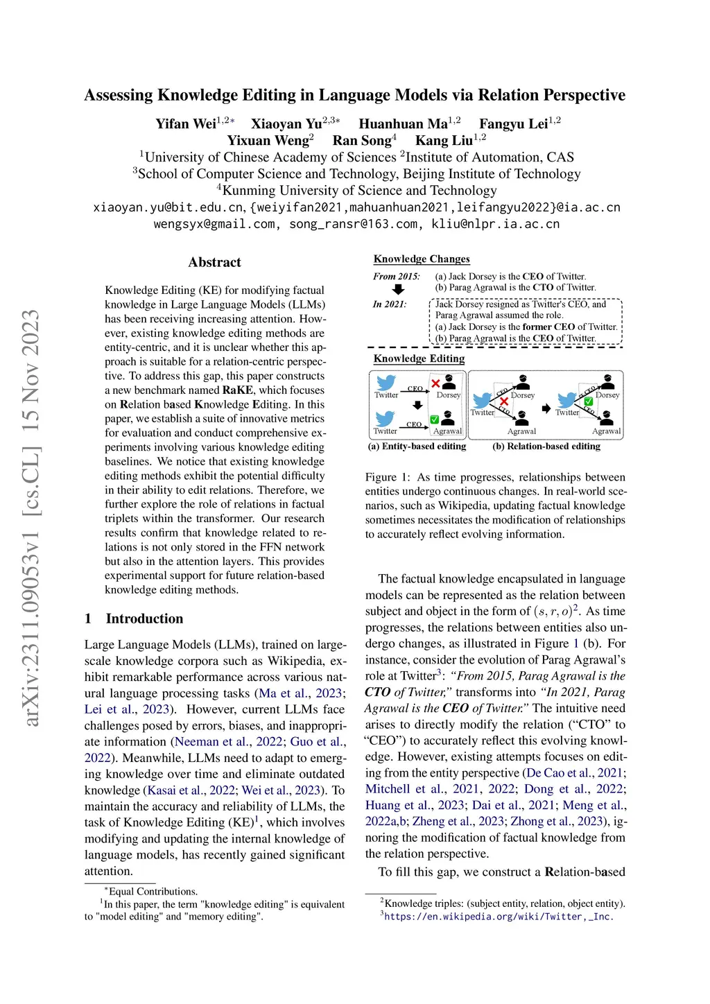 Knowledge Editing (KE) for modifying factual knowledge in Large Language Models (LLMs) has been receiving increasing attention. However, existing knowledge editing methods are entity-centric, and it is unclear whether this approach is suitable for a relation-centric perspective. To address this gap, this paper constructs a new benchmark named RaKE, which focuses on Relation based Knowledge Editing. In this paper, we establish a suite of innovative metrics for evaluation and conduct comprehensive experiments involving various knowledge editing baselines. We notice that existing knowledge editing methods exhibit the potential difficulty in their ability to edit relations. Therefore, we further explore the role of relations in factual triplets within the transformer. Our research results confirm that knowledge related to relations is not only stored in the FFN network but also in the attention layers. This provides experimental support for future relation-based knowledge editing methods.