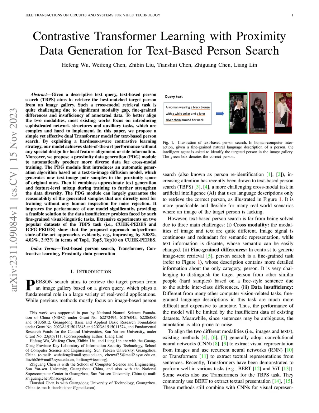 Given a descriptive text query, text-based person search (TBPS) aims to retrieve the best-matched target person from an image gallery. Such a cross-modal retrieval task is quite challenging due to significant modality gap, fine-grained differences and insufficiency of annotated data. To better align the two modalities, most existing works focus on introducing sophisticated network structures and auxiliary tasks, which are complex and hard to implement. In this paper, we propose a simple yet effective dual Transformer model for text-based person search. By exploiting a hardness-aware contrastive learning strategy, our model achieves state-of-the-art performance without any special design for local feature alignment or side information. Moreover, we propose a proximity data generation (PDG) module to automatically produce more diverse data for cross-modal training. The PDG module first introduces an automatic generation algorithm based on a text-to-image diffusion model, which generates new text-image pair samples in the proximity space of original ones. Then it combines approximate text generation and feature-level mixup during training to further strengthen the data diversity. The PDG module can largely guarantee the reasonability of the generated samples that are directly used for training without any human inspection for noise rejection. It improves the performance of our model significantly, providing a feasible solution to the data insufficiency problem faced by such fine-grained visual-linguistic tasks. Extensive experiments on two popular datasets of the TBPS task (i.e., CUHK-PEDES and ICFG-PEDES) show that the proposed approach outperforms state-of-the-art approaches evidently, e.g., improving by 3.88%, 4.02%, 2.92% in terms of Top1, Top5, Top10 on CUHK-PEDES. The codes will be available at https://github.com/HCPLab-SYSU/PersonSearch-CTLG