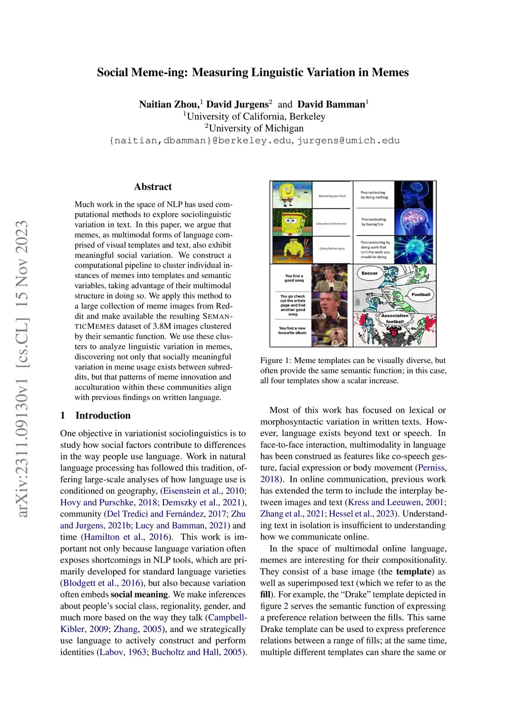 Much work in the space of NLP has used computational methods to explore sociolinguistic variation in text. In this paper, we argue that memes, as multimodal forms of language comprised of visual templates and text, also exhibit meaningful social variation. We construct a computational pipeline to cluster individual instances of memes into templates and semantic variables, taking advantage of their multimodal structure in doing so. We apply this method to a large collection of meme images from Reddit and make available the resulting \textsc{SemanticMemes} dataset of 3.8M images clustered by their semantic function. We use these clusters to analyze linguistic variation in memes, discovering not only that socially meaningful variation in meme usage exists between subreddits, but that patterns of meme innovation and acculturation within these communities align with previous findings on written language.