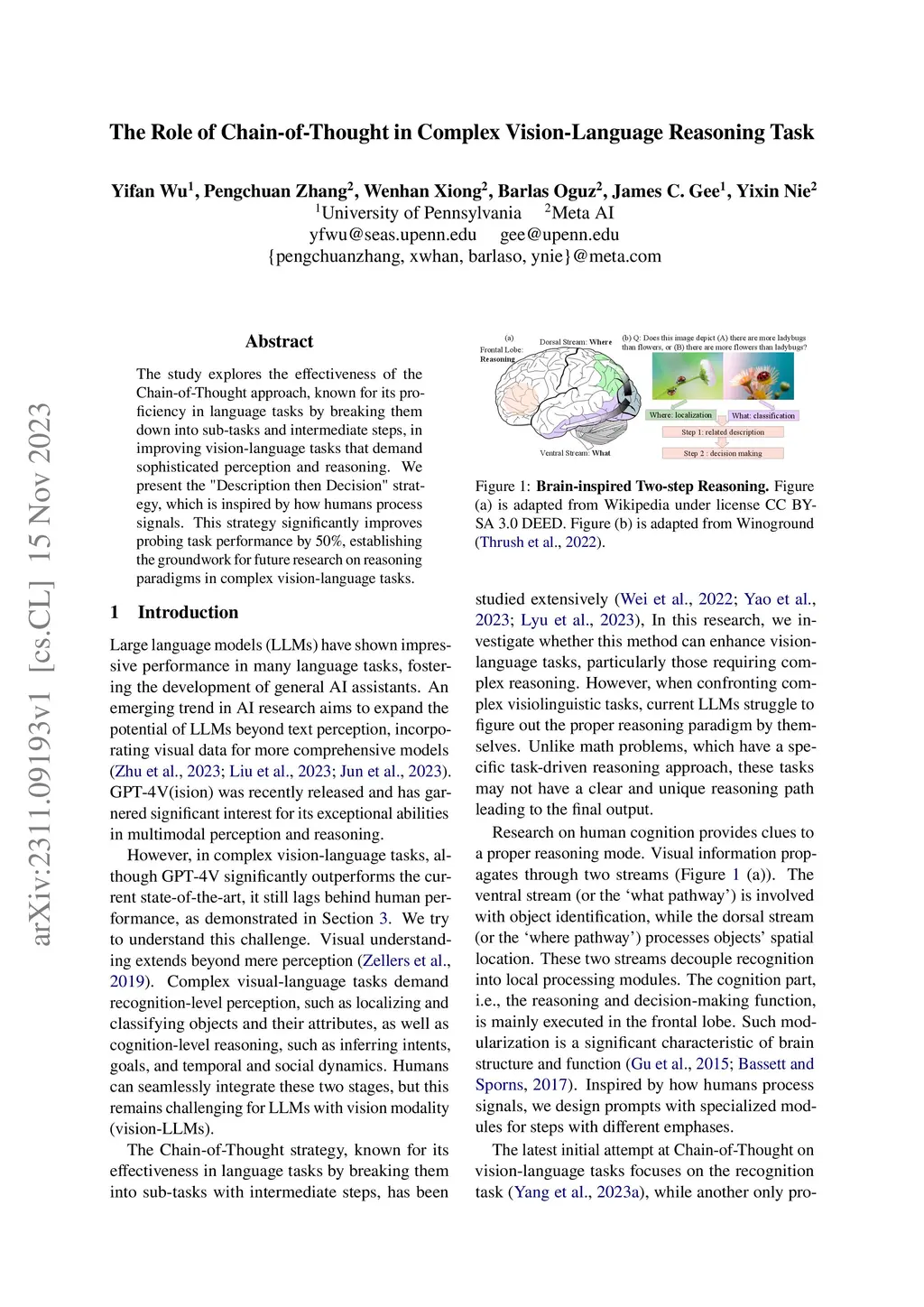 The study explores the effectiveness of the Chain-of-Thought approach, known for its proficiency in language tasks by breaking them down into sub-tasks and intermediate steps, in improving vision-language tasks that demand sophisticated perception and reasoning. We present the "Description then Decision" strategy, which is inspired by how humans process signals. This strategy significantly improves probing task performance by 50%, establishing the groundwork for future research on reasoning paradigms in complex vision-language tasks.