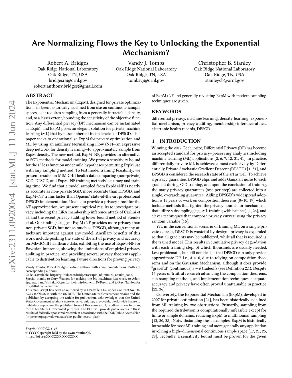 The Exponential Mechanism (ExpM), designed for private optimization, has been historically sidelined from use on continuous sample spaces, as it requires sampling from a generally intractable density, and, to a lesser extent, bounding the sensitivity of the objective function. Any differential privacy (DP) mechanism can be instantiated as ExpM, and ExpM poses an elegant solution for private machine learning (ML) that bypasses inherent inefficiencies of DPSGD. This paper seeks to operationalize ExpM for private optimization and ML by using an auxiliary Normalizing Flow (NF), an expressive deep network for density learning, to approximately sample from ExpM density. The method, ExpM+NF is an alternative to SGD methods for model training. We prove a sensitivity bound for the loss permitting ExpM use with any sampling method. To test feasibility, we present results on MIMIC-III health data comparing (non-private) SGD, DPSGD, and ExpM+NF training methods' accuracy and training time. We find that a model sampled from ExpM+NF is nearly as accurate as non-private SGD, more accurate than DPSGD, and ExpM+NF trains faster than Opacus' DPSGD implementation. Unable to provide a privacy proof for the NF approximation, we present empirical results to investigate privacy including the LiRA membership inference attack of Carlini et al. and the recent privacy auditing lower bound method of Steinke et al. Our findings suggest ExpM+NF provides more privacy than non-private SGD, but not as much as DPSGD, although many attacks are impotent against any model. Ancillary benefits of this work include pushing the SOTA of privacy and accuracy on MIMIC-III healthcare data, exhibiting the use of ExpM+NF for Bayesian inference, showing the limitations of empirical privacy auditing in practice, and providing several privacy theorems applicable to distribution learning.
