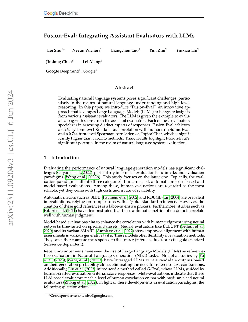 Evaluating natural language systems poses significant challenges, particularly in the realms of natural language understanding and high-level reasoning. In this paper, we introduce 'Fusion-Eval', an innovative approach that leverages Large Language Models (LLMs) to integrate insights from various assistant evaluators. The LLM is given the example to evaluate along with scores from the assistant evaluators. Each of these evaluators specializes in assessing distinct aspects of responses. Fusion-Eval achieves a 0.962 system-level Kendall-Tau correlation with humans on SummEval and a 0.744 turn-level Spearman correlation on TopicalChat, which is significantly higher than baseline methods. These results highlight Fusion-Eval's significant potential in the realm of natural language system evaluation.