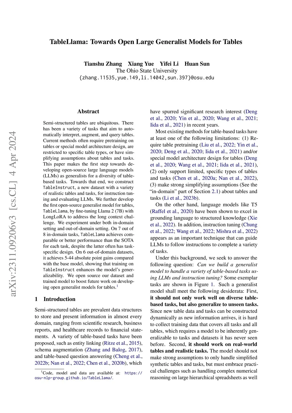 Semi-structured tables are ubiquitous. There has been a variety of tasks that aim to automatically interpret, augment, and query tables. Current methods often require pretraining on tables or special model architecture design, are restricted to specific table types, or have simplifying assumptions about tables and tasks. This paper makes the first step towards developing open-source large language models (LLMs) as generalists for a diversity of table-based tasks. Towards that end, we construct TableInstruct, a new dataset with a variety of realistic tables and tasks, for instruction tuning and evaluating LLMs. We further develop the first open-source generalist model for tables, TableLlama, by fine-tuning Llama 2 (7B) with LongLoRA to address the long context challenge. We experiment under both in-domain setting and out-of-domain setting. On 7 out of 8 in-domain tasks, TableLlama achieves comparable or better performance than the SOTA for each task, despite the latter often has task-specific design. On 6 out-of-domain datasets, it achieves 5-44 absolute point gains compared with the base model, showing that training on TableInstruct enhances the model's generalizability. We open-source our dataset and trained model to boost future work on developing open generalist models for tables.
