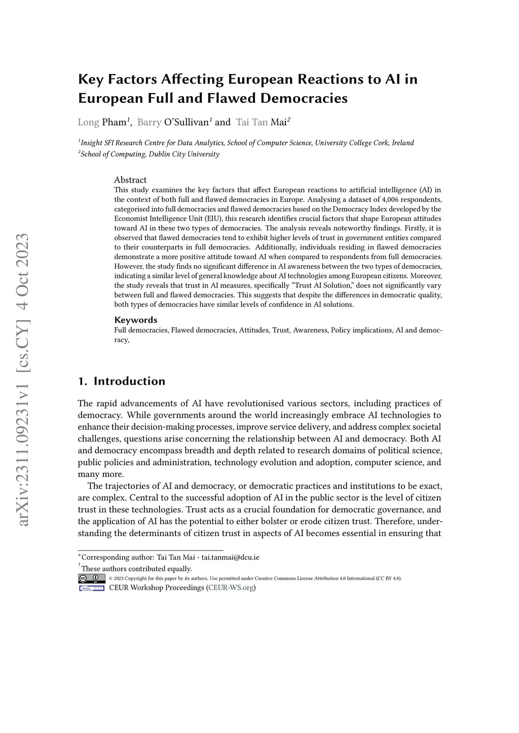 This study examines the key factors that affect European reactions to artificial intelligence (AI) in the context of both full and flawed democracies in Europe. Analysing a dataset of 4,006 respondents, categorised into full democracies and flawed democracies based on the Democracy Index developed by the Economist Intelligence Unit (EIU), this research identifies crucial factors that shape European attitudes toward AI in these two types of democracies. The analysis reveals noteworthy findings. Firstly, it is observed that flawed democracies tend to exhibit higher levels of trust in government entities compared to their counterparts in full democracies. Additionally, individuals residing in flawed democracies demonstrate a more positive attitude toward AI when compared to respondents from full democracies. However, the study finds no significant difference in AI awareness between the two types of democracies, indicating a similar level of general knowledge about AI technologies among European citizens. Moreover, the study reveals that trust in AI measures, specifically "Trust AI Solution", does not significantly vary between full and flawed democracies. This suggests that despite the differences in democratic quality, both types of democracies have similar levels of confidence in AI solutions.
