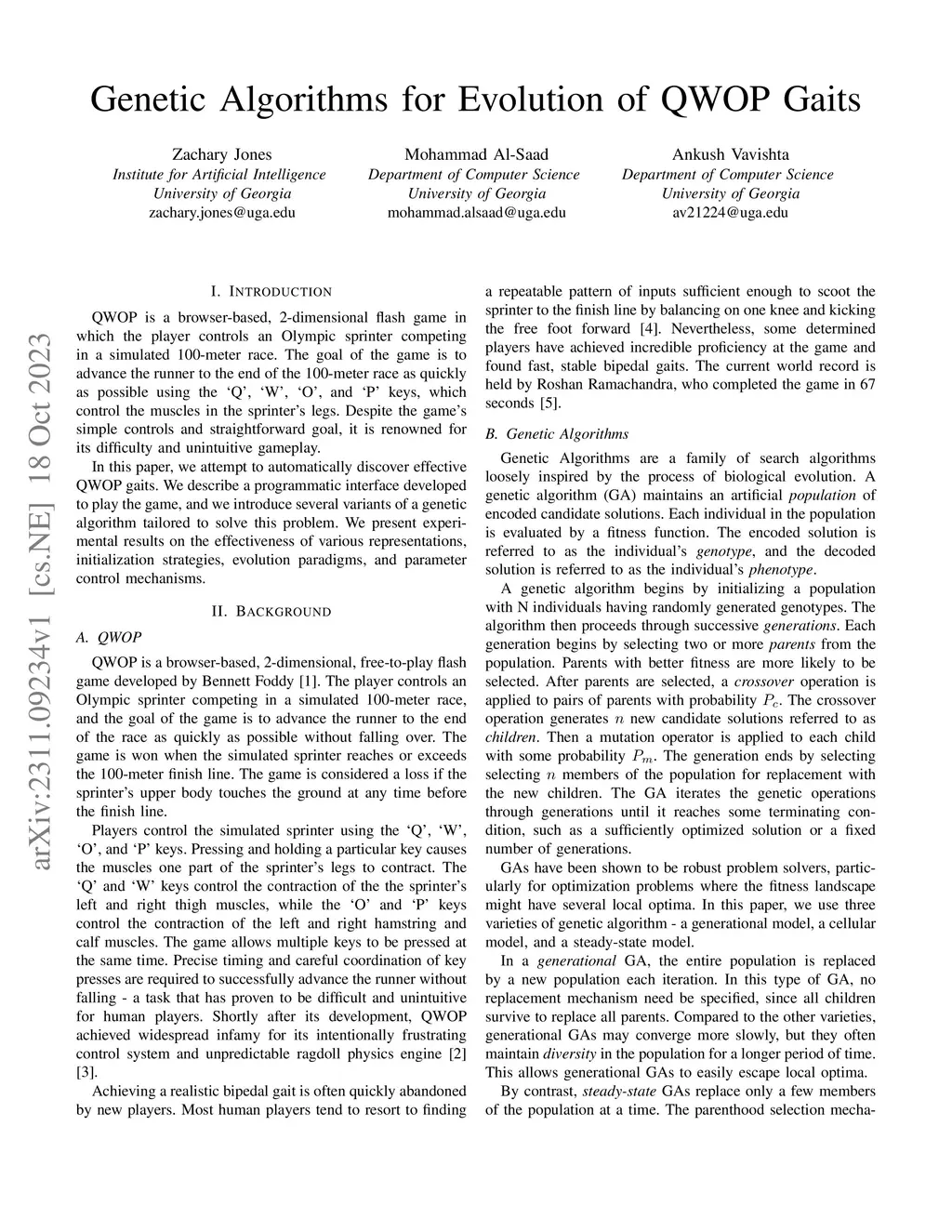 QWOP is a browser-based, 2-dimensional flash game in which the player controls an Olympic sprinter competing in a simulated 100-meter race. The goal of the game is to advance the runner to the end of the 100-meter race as quickly as possible using the Q, W, O, and P keys, which control the muscles in the sprinters legs. Despite the game simple controls and straightforward goal, it is renowned for its difficulty and unintuitive gameplay. In this paper, we attempt to automatically discover effective QWOP gaits. We describe a programmatic interface developed to play the game, and we introduce several variants of a genetic algorithm tailored to solve this problem. We present experimental results on the effectiveness of various representations, initialization strategies, evolution paradigms, and parameter control mechanisms.