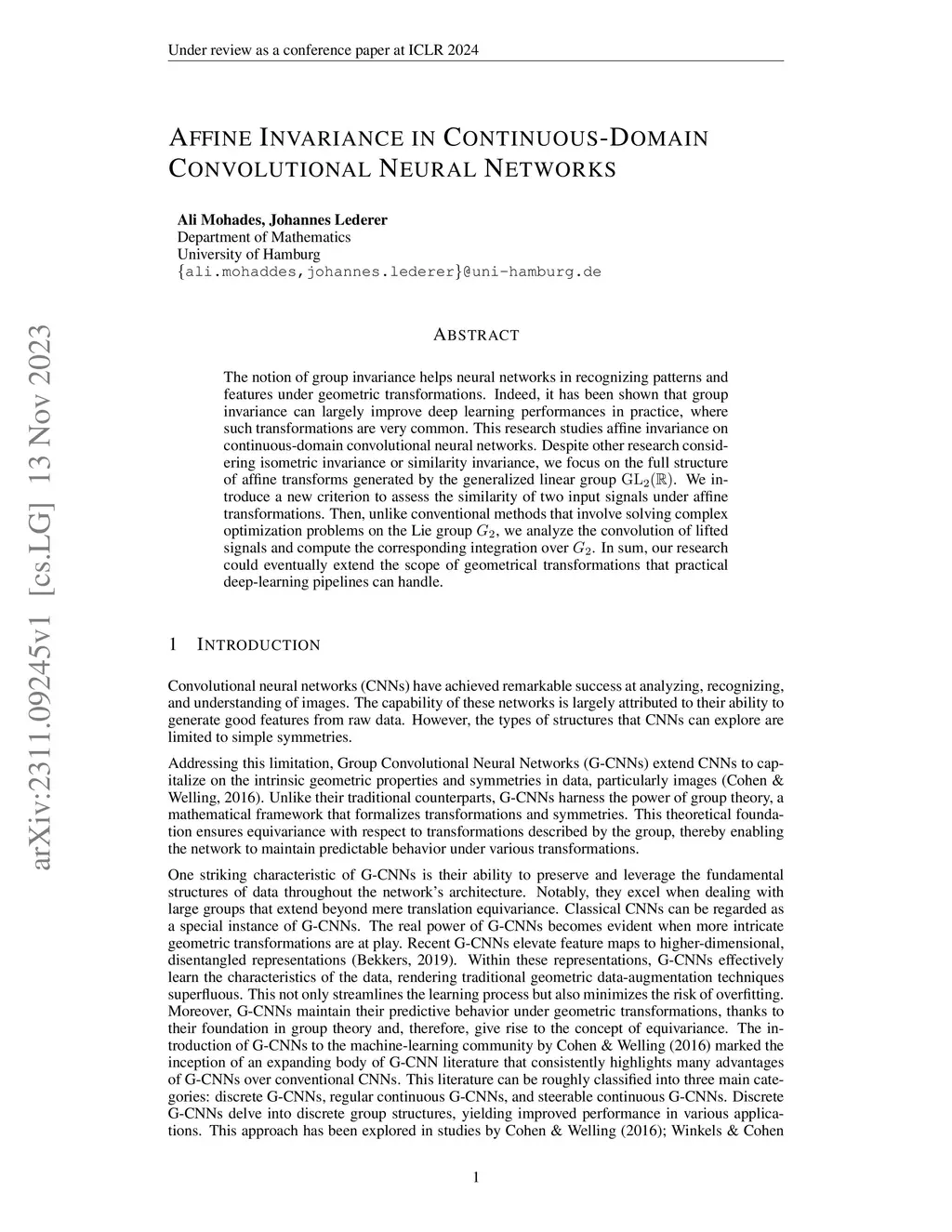 The notion of group invariance helps neural networks in recognizing patterns and features under geometric transformations. Group convolutional neural networks enhance traditional convolutional neural networks by incorporating group-based geometric structures into their design. This research studies affine invariance on continuous-domain convolutional neural networks. Despite other research considering isometric invariance or similarity invariance, we focus on the full structure of affine transforms generated by the group of all invertible real matrices (generalized linear group ). We introduce a new criterion to assess the invariance of two signals under affine transformations. The input image is embedded into the affine Lie group to facilitate group convolution operations that respect affine invariance. Then, we analyze the convolution of embedded signals over . In sum, our research could eventually extend the scope of geometrical transformations that usual deep-learning pipelines can handle.