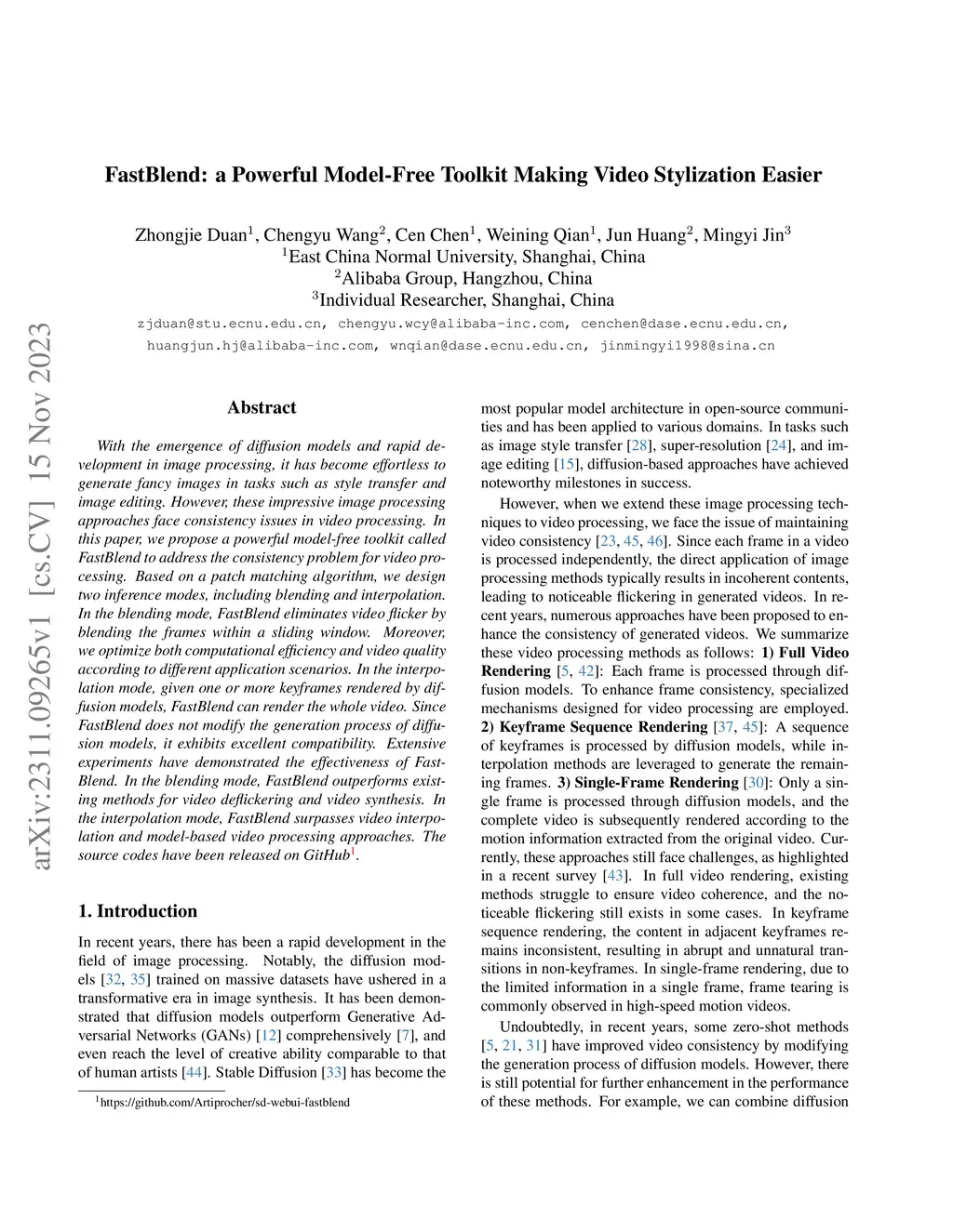 With the emergence of diffusion models and rapid development in image processing, it has become effortless to generate fancy images in tasks such as style transfer and image editing. However, these impressive image processing approaches face consistency issues in video processing. In this paper, we propose a powerful model-free toolkit called FastBlend to address the consistency problem for video processing. Based on a patch matching algorithm, we design two inference modes, including blending and interpolation. In the blending mode, FastBlend eliminates video flicker by blending the frames within a sliding window. Moreover, we optimize both computational efficiency and video quality according to different application scenarios. In the interpolation mode, given one or more keyframes rendered by diffusion models, FastBlend can render the whole video. Since FastBlend does not modify the generation process of diffusion models, it exhibits excellent compatibility. Extensive experiments have demonstrated the effectiveness of FastBlend. In the blending mode, FastBlend outperforms existing methods for video deflickering and video synthesis. In the interpolation mode, FastBlend surpasses video interpolation and model-based video processing approaches. The source codes have been released on GitHub.