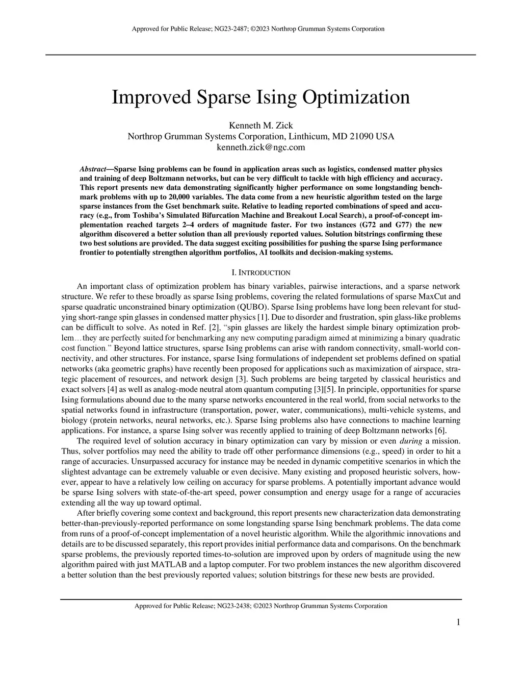 Sparse Ising problems can be found in application areas such as logistics, condensed matter physics and training of deep Boltzmann networks, but can be very difficult to tackle with high efficiency and accuracy. This report presents new data demonstrating significantly higher performance on some longstanding benchmark problems with up to 20,000 variables. The data come from a new heuristic algorithm tested on the large sparse instances from the Gset benchmark suite. Relative to leading reported combinations of speed and accuracy (e.g., from Toshiba's Simulated Bifurcation Machine and Breakout Local Search), a proof-of-concept implementation reached targets 2-4 orders of magnitude faster. For two instances (G72 and G77) the new algorithm discovered a better solution than all previously reported values. Solution bitstrings confirming these two best solutions are provided. The data suggest exciting possibilities for pushing the sparse Ising performance frontier to potentially strengthen algorithm portfolios, AI toolkits and decision-making systems.