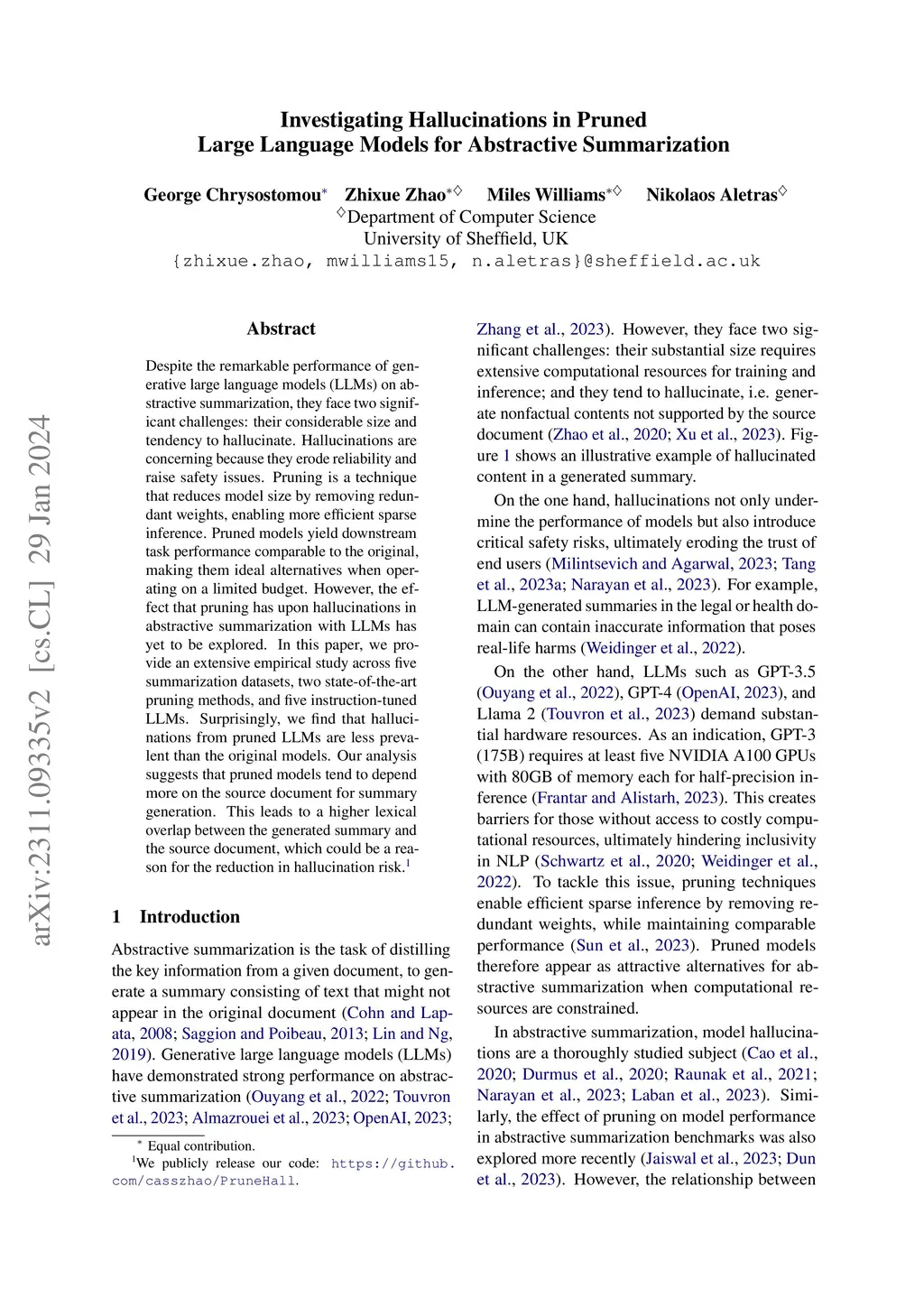 Despite the remarkable performance of generative large language models (LLMs) on abstractive summarization, they face two significant challenges: their considerable size and tendency to hallucinate. Hallucinations are concerning because they erode reliability and raise safety issues. Pruning is a technique that reduces model size by removing redundant weights, enabling more efficient sparse inference. Pruned models yield downstream task performance comparable to the original, making them ideal alternatives when operating on a limited budget. However, the effect that pruning has upon hallucinations in abstractive summarization with LLMs has yet to be explored. In this paper, we provide an extensive empirical study across five summarization datasets, two state-of-the-art pruning methods, and five instruction-tuned LLMs. Surprisingly, we find that hallucinations from pruned LLMs are less prevalent than the original models. Our analysis suggests that pruned models tend to depend more on the source document for summary generation. This leads to a higher lexical overlap between the generated summary and the source document, which could be a reason for the reduction in hallucination risk.