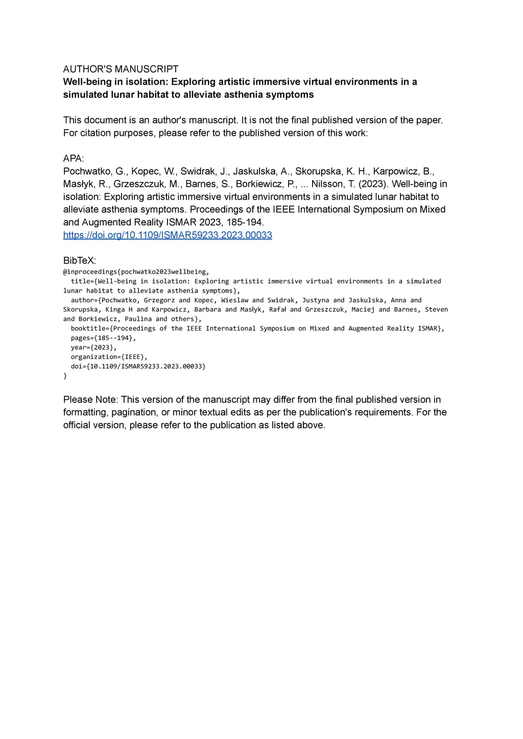 Well-being in isolation: Exploring artistic immersive virtual