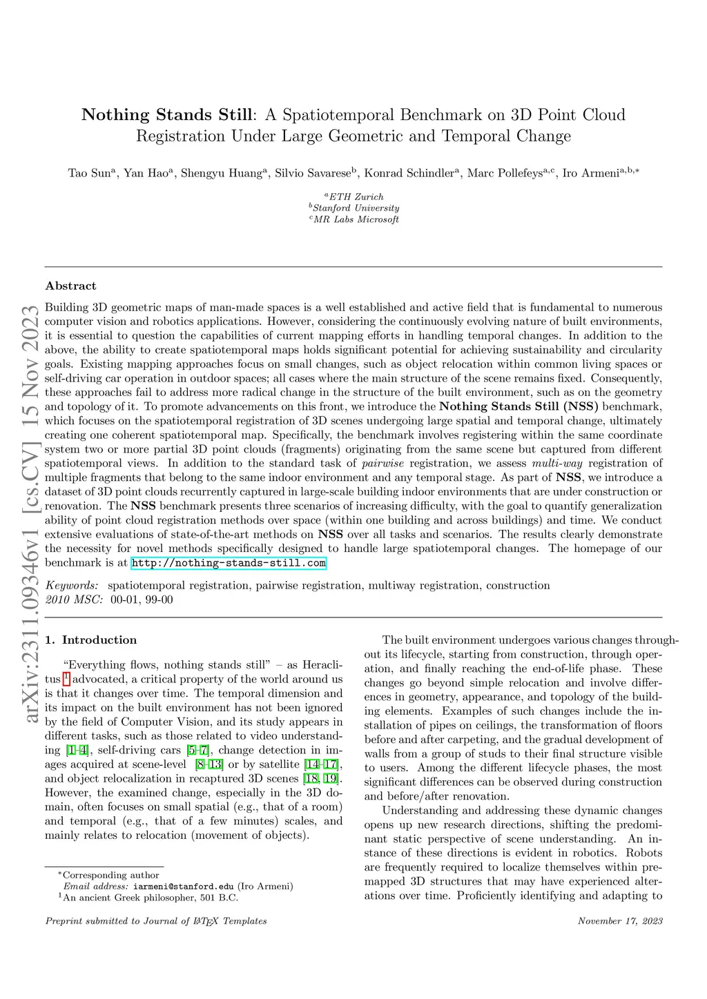Building 3D geometric maps of man-made spaces is a well-established and active field that is fundamental to computer vision and robotics. However, considering the evolving nature of built environments, it is essential to question the capabilities of current mapping efforts in handling temporal changes. In addition, spatiotemporal mapping holds significant potential for achieving sustainability and circularity goals. Existing mapping approaches focus on small changes, such as object relocation or self-driving car operation; in all cases where the main structure of the scene remains fixed. Consequently, these approaches fail to address more radical changes in the structure of the built environment, such as geometry and topology. To this end, we introduce the Nothing Stands Still (NSS) benchmark, which focuses on the spatiotemporal registration of 3D scenes undergoing large spatial and temporal change, ultimately creating one coherent spatiotemporal map. Specifically, the benchmark involves registering two or more partial 3D point clouds (fragments) from the same scene but captured from different spatiotemporal views. In addition to the standard pairwise registration, we assess the multi-way registration of multiple fragments that belong to any temporal stage. As part of NSS, we introduce a dataset of 3D point clouds recurrently captured in large-scale building indoor environments that are under construction or renovation. The NSS benchmark presents three scenarios of increasing difficulty, to quantify the generalization ability of point cloud registration methods over space (within one building and across buildings) and time. We conduct extensive evaluations of state-of-the-art methods on NSS. The results demonstrate the necessity for novel methods specifically designed to handle large spatiotemporal changes. The homepage of our benchmark is atthis http URL.