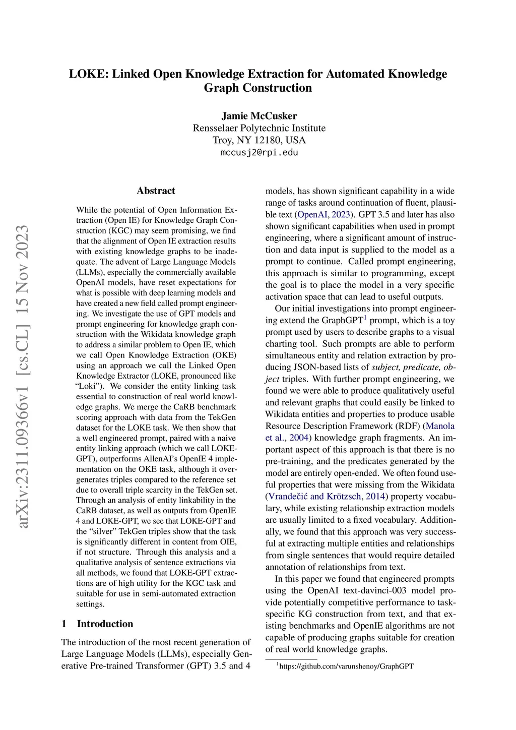 While the potential of Open Information Extraction (Open IE) for Knowledge Graph Construction (KGC) may seem promising, we find that the alignment of Open IE extraction results with existing knowledge graphs to be inadequate. The advent of Large Language Models (LLMs), especially the commercially available OpenAI models, have reset expectations for what is possible with deep learning models and have created a new field called prompt engineering. We investigate the use of GPT models and prompt engineering for knowledge graph construction with the Wikidata knowledge graph to address a similar problem to Open IE, which we call Open Knowledge Extraction (OKE) using an approach we call the Linked Open Knowledge Extractor (LOKE, pronounced like "Loki"). We consider the entity linking task essential to construction of real world knowledge graphs. We merge the CaRB benchmark scoring approach with data from the TekGen dataset for the LOKE task. We then show that a well engineered prompt, paired with a naive entity linking approach (which we call LOKE-GPT), outperforms AllenAI's OpenIE 4 implementation on the OKE task, although it over-generates triples compared to the reference set due to overall triple scarcity in the TekGen set. Through an analysis of entity linkability in the CaRB dataset, as well as outputs from OpenIE 4 and LOKE-GPT, we see that LOKE-GPT and the "silver" TekGen triples show that the task is significantly different in content from OIE, if not structure. Through this analysis and a qualitative analysis of sentence extractions via all methods, we found that LOKE-GPT extractions are of high utility for the KGC task and suitable for use in semi-automated extraction settings.