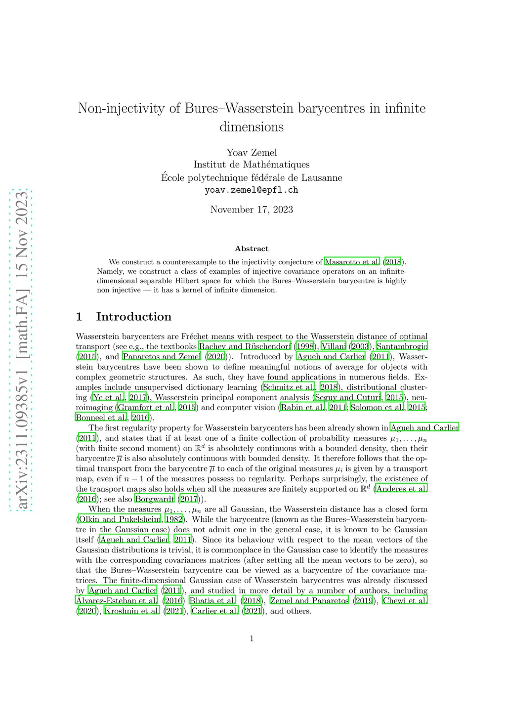 We construct a counterexample to the injectivity conjecture of Masarotto et al (2018). Namely, we construct a class of examples of injective covariance operators on an infinite-dimensional separable Hilbert space for which the Bures--Wasserstein barycentre is highly non injective -- it has a kernel of infinite dimension.
