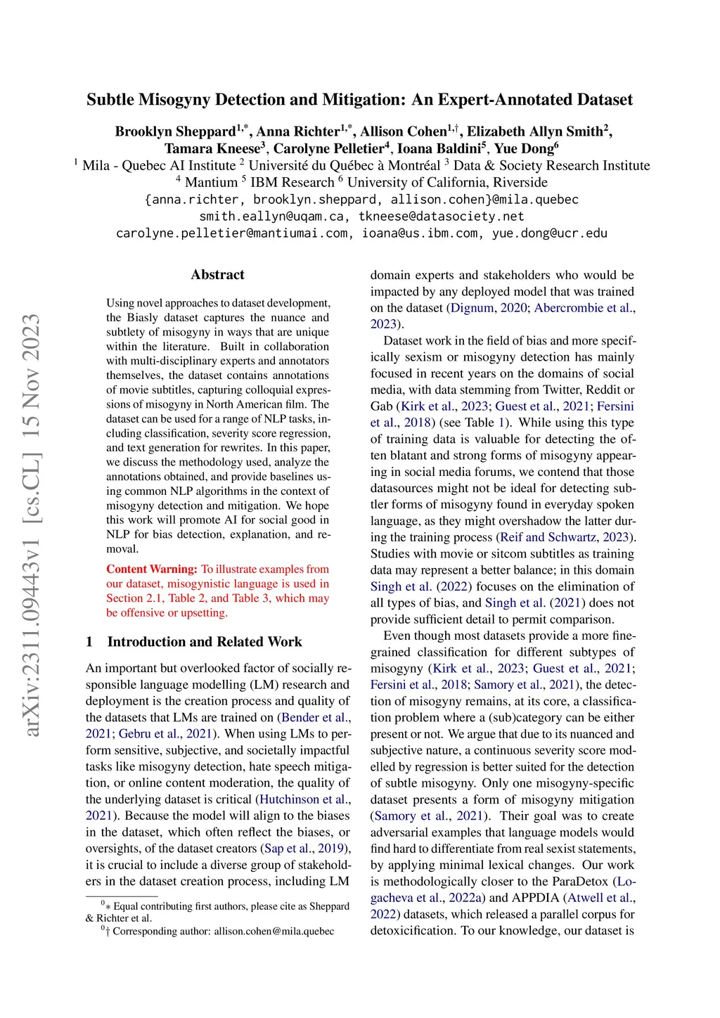 Using novel approaches to dataset development, the Biasly dataset captures the nuance and subtlety of misogyny in ways that are unique within the literature. Built in collaboration with multi-disciplinary experts and annotators themselves, the dataset contains annotations of movie subtitles, capturing colloquial expressions of misogyny in North American film. The dataset can be used for a range of NLP tasks, including classification, severity score regression, and text generation for rewrites. In this paper, we discuss the methodology used, analyze the annotations obtained, and provide baselines using common NLP algorithms in the context of misogyny detection and mitigation. We hope this work will promote AI for social good in NLP for bias detection, explanation, and removal.